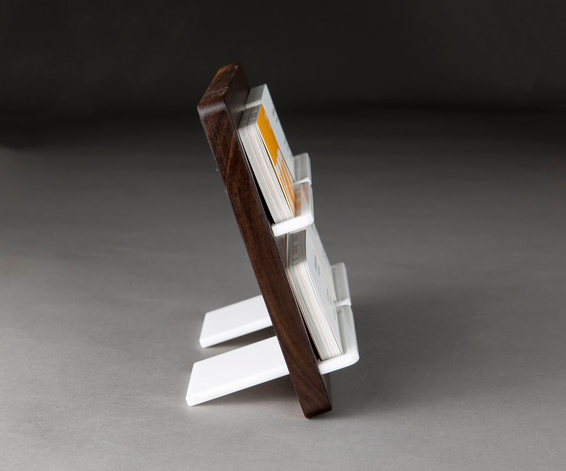 Minimalist business card stand for two cards is made of solid black walnut and white acrylic (on photo). Also available in oak and maple. Perfect final touch for a modern Desk / Office / Front Desk / Reception.