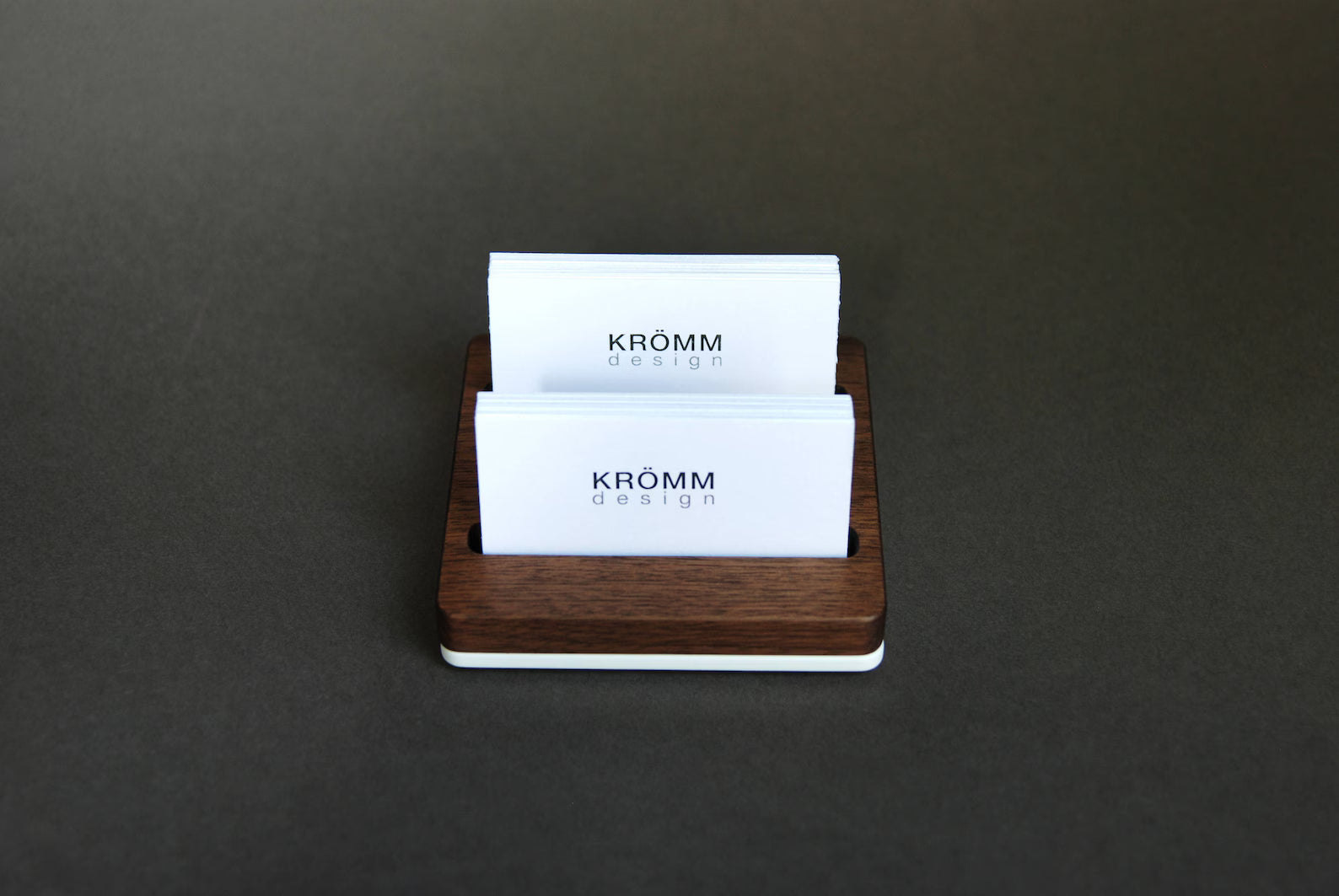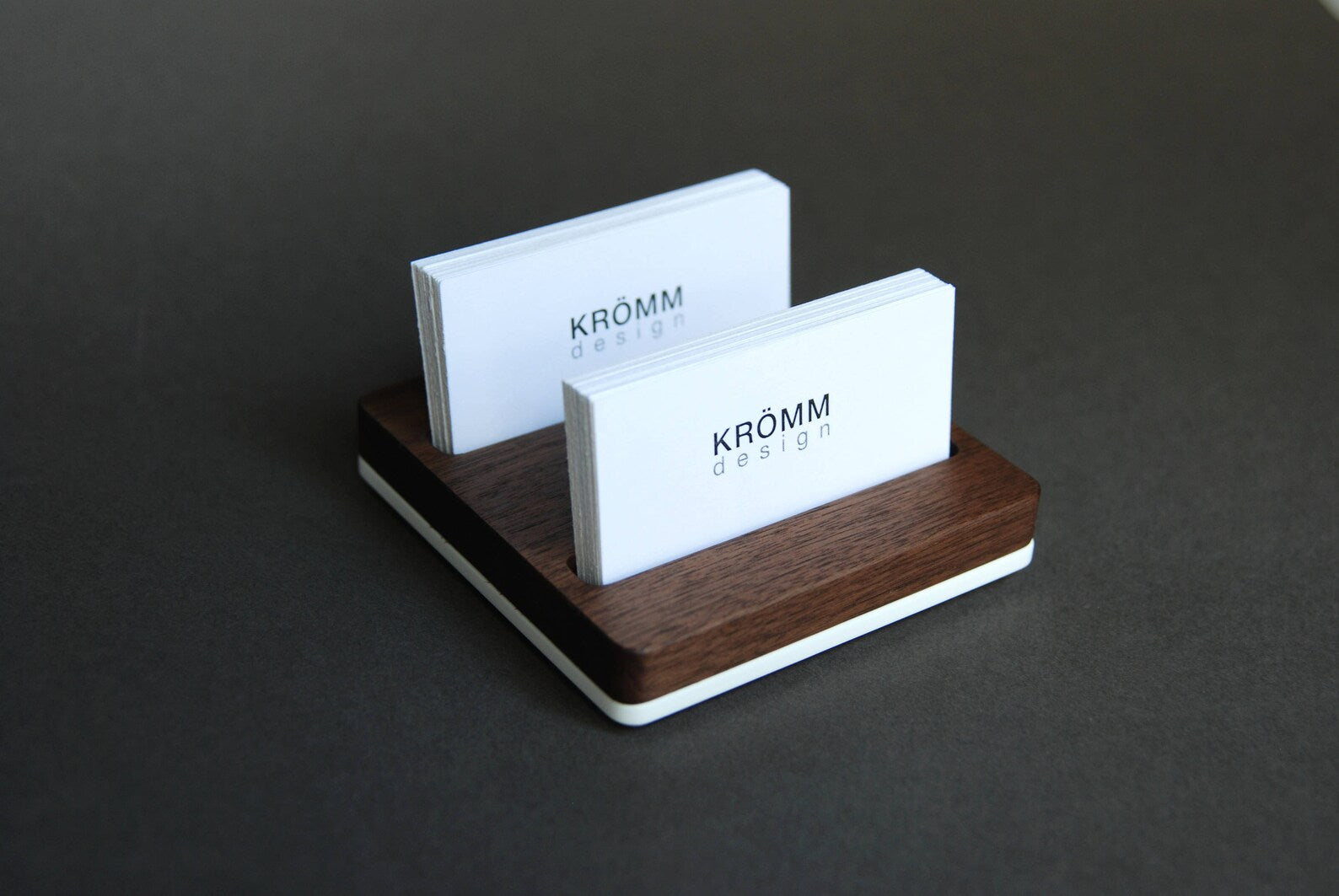 Simple but luxurious business card stand is made of solid black walnut wood and 1/4” white acrylic (on photo). Also available in Oak or Maple.