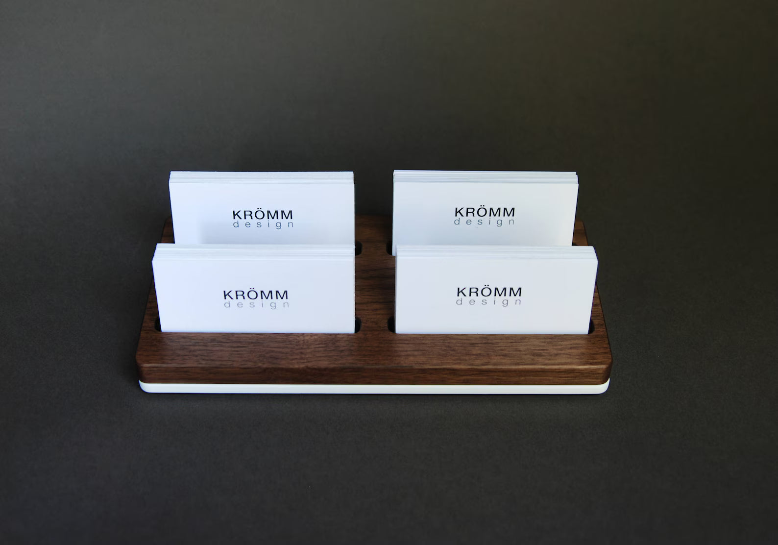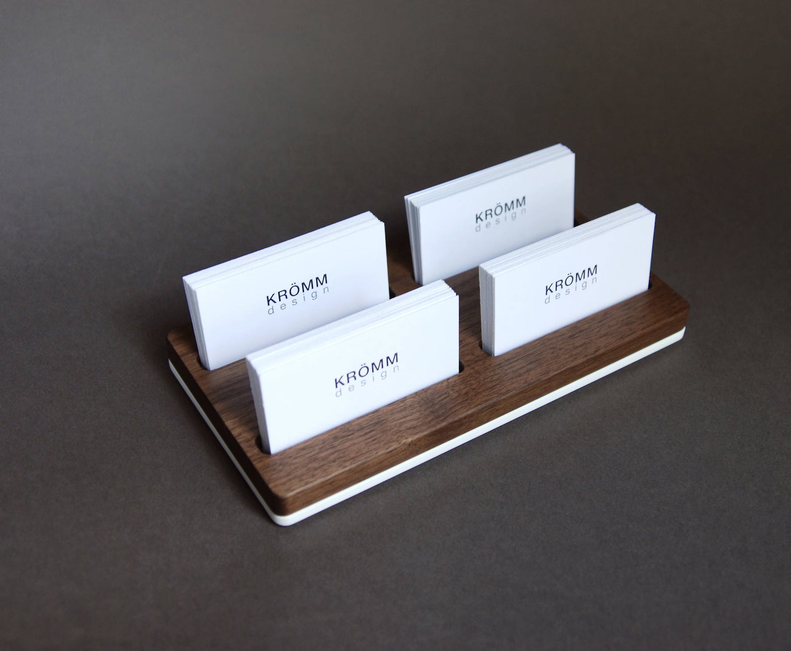 Simple but luxurious business card stand is made of solid black walnut wood and 1/4” white acrylic (on photo). Also available in Oak or Maple.