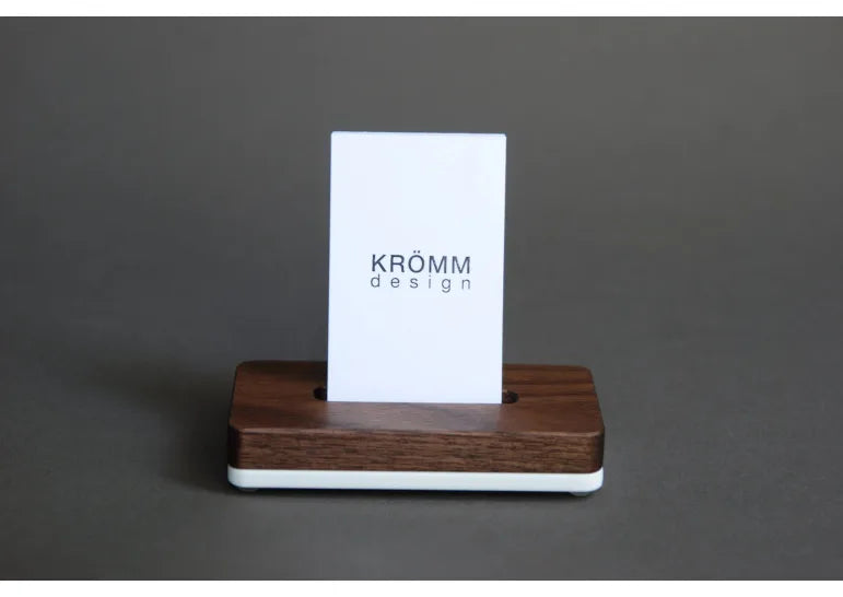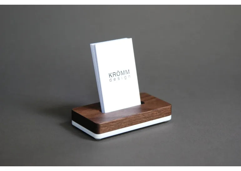 Simple but luxurious business card stand is made of solid black walnut wood and 1/4” white acrylic (on photo). Also available in Oak or Maple.