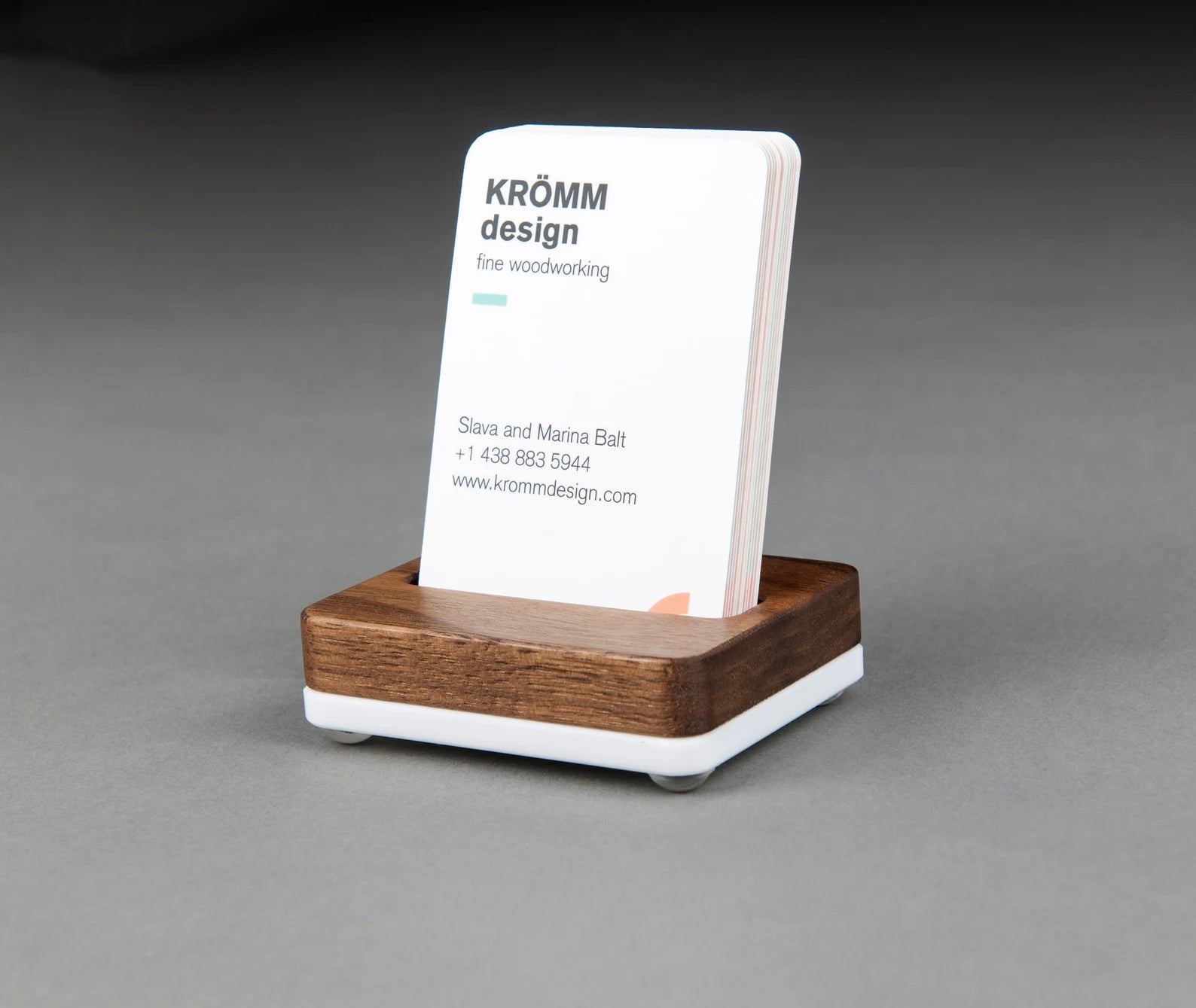 Simple but luxurious business card stand is made of solid black walnut wood and 1/4” white acrylic (on photo). Also available in Oak or Maple.