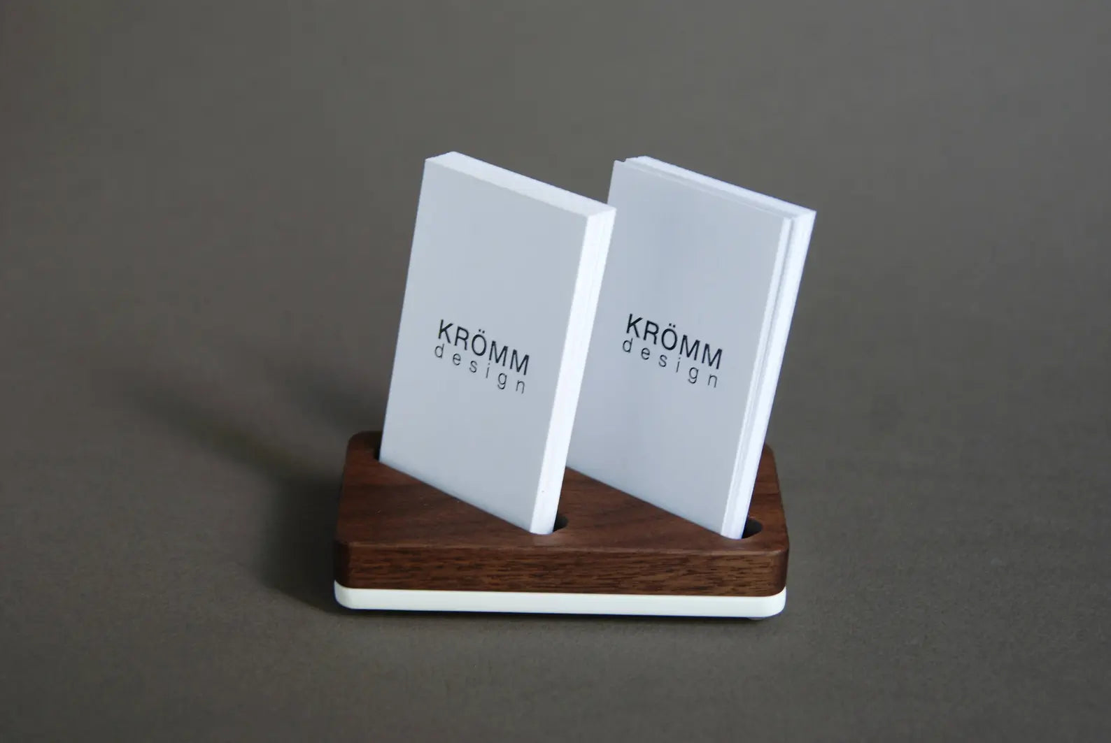 Simple but luxurious business card stand is made of solid black walnut wood and 1/4” white acrylic (on photo). Also available in Oak or Maple.