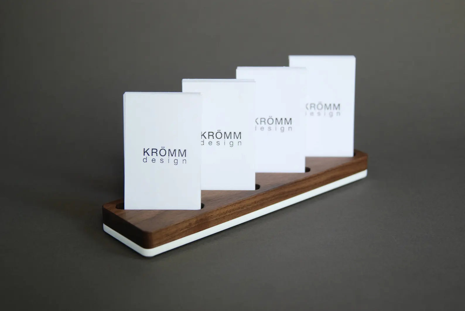 Simple but luxurious business card stand is made of solid black walnut wood and 1/4” white acrylic (on photo). Also available in Oak or Maple.