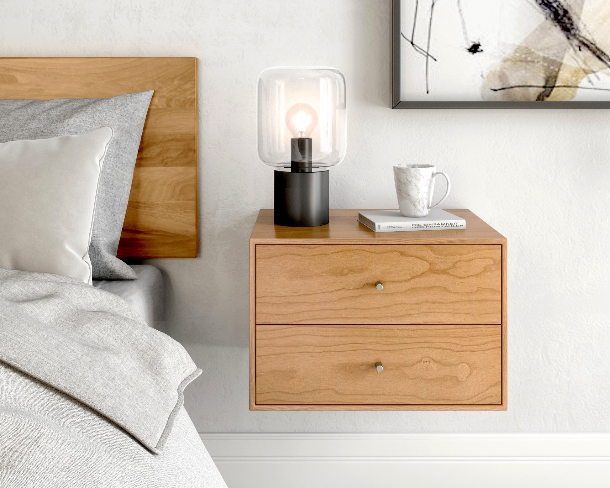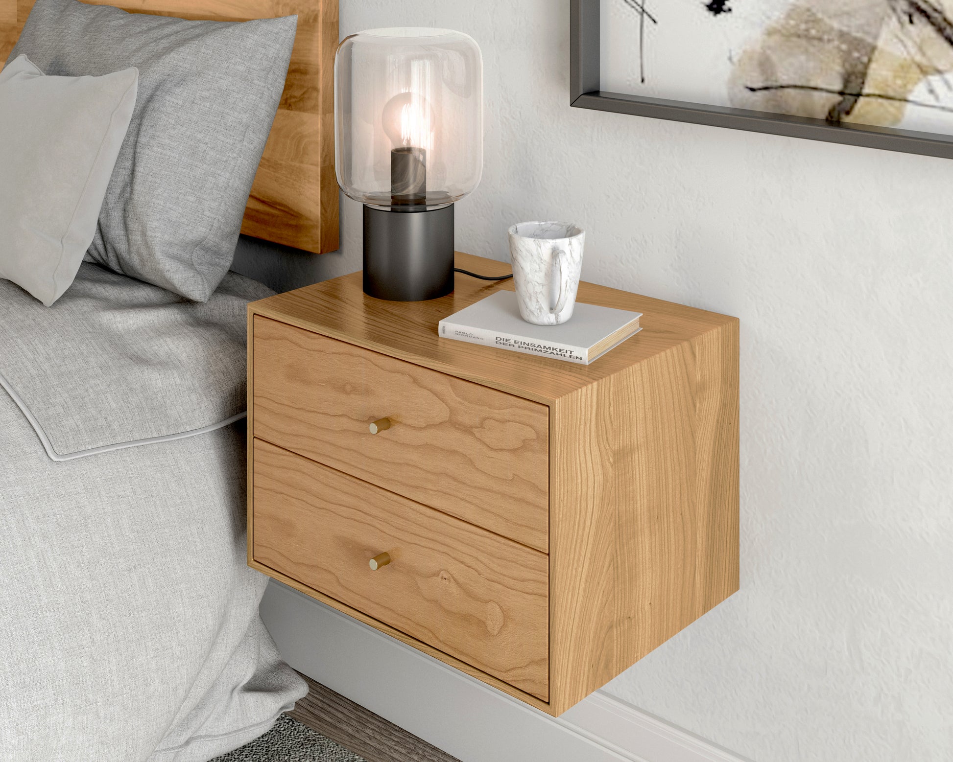 This minimalist floating bedside table with 2 drawers, inspired by iconic Mid-century design, is crafted by hand in solid Cherry wood.