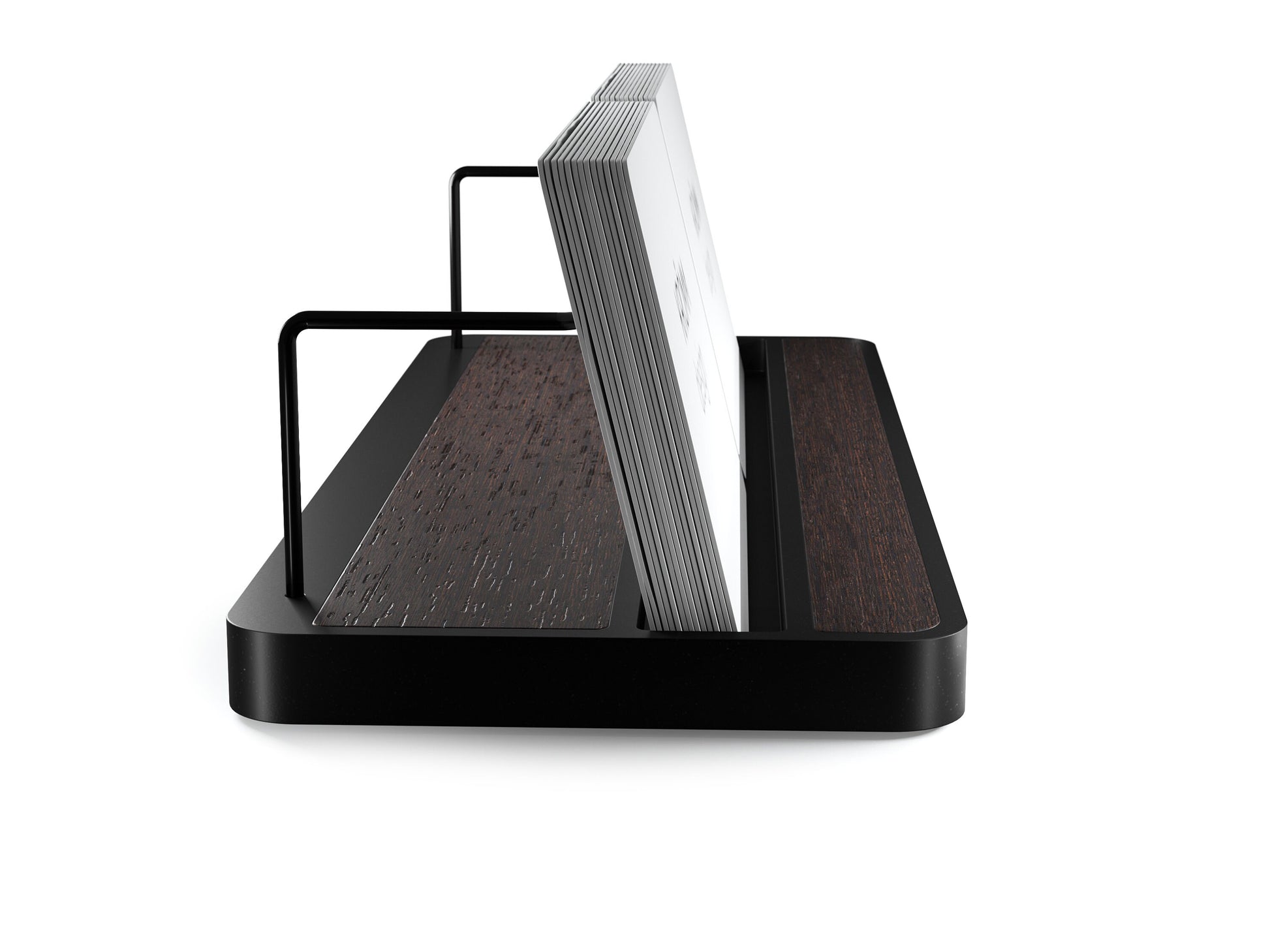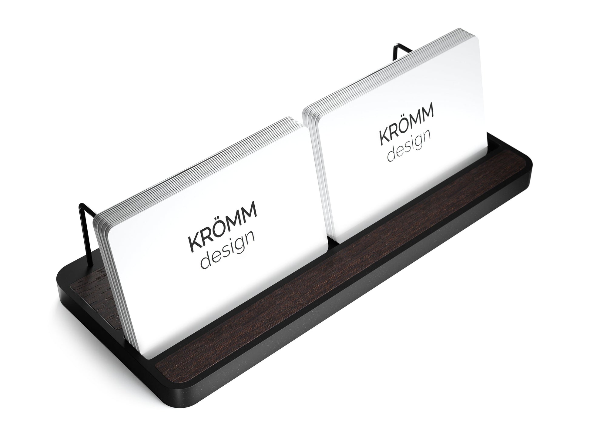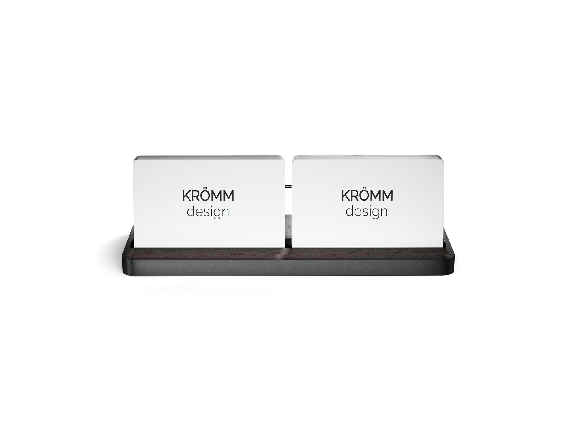 This modern business card stand / display is made of black anodized aluminum and features luxury Wenge wood inserts.