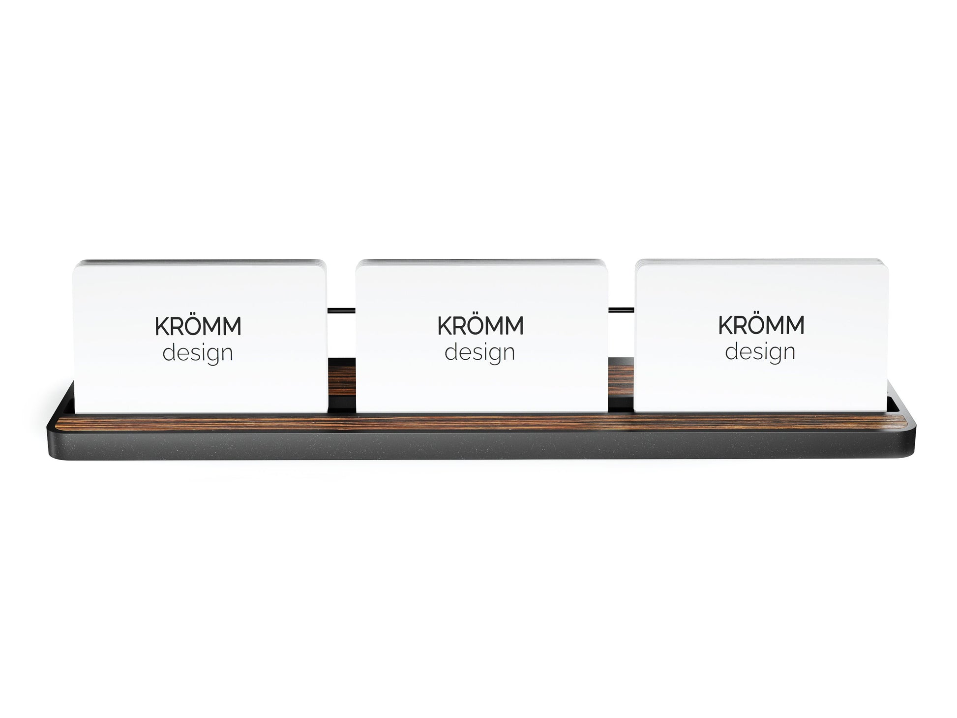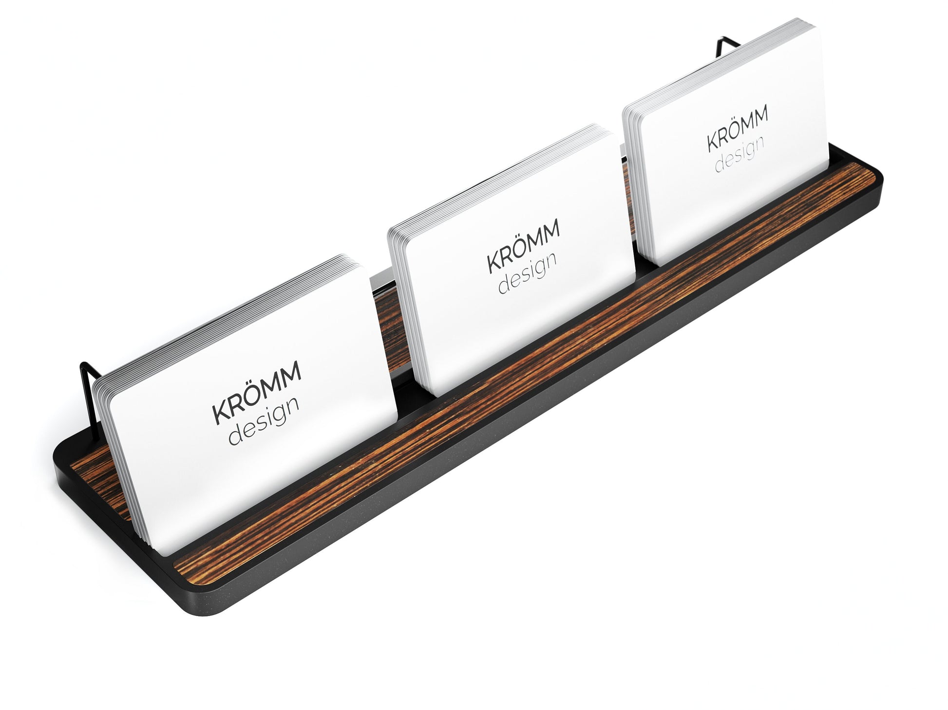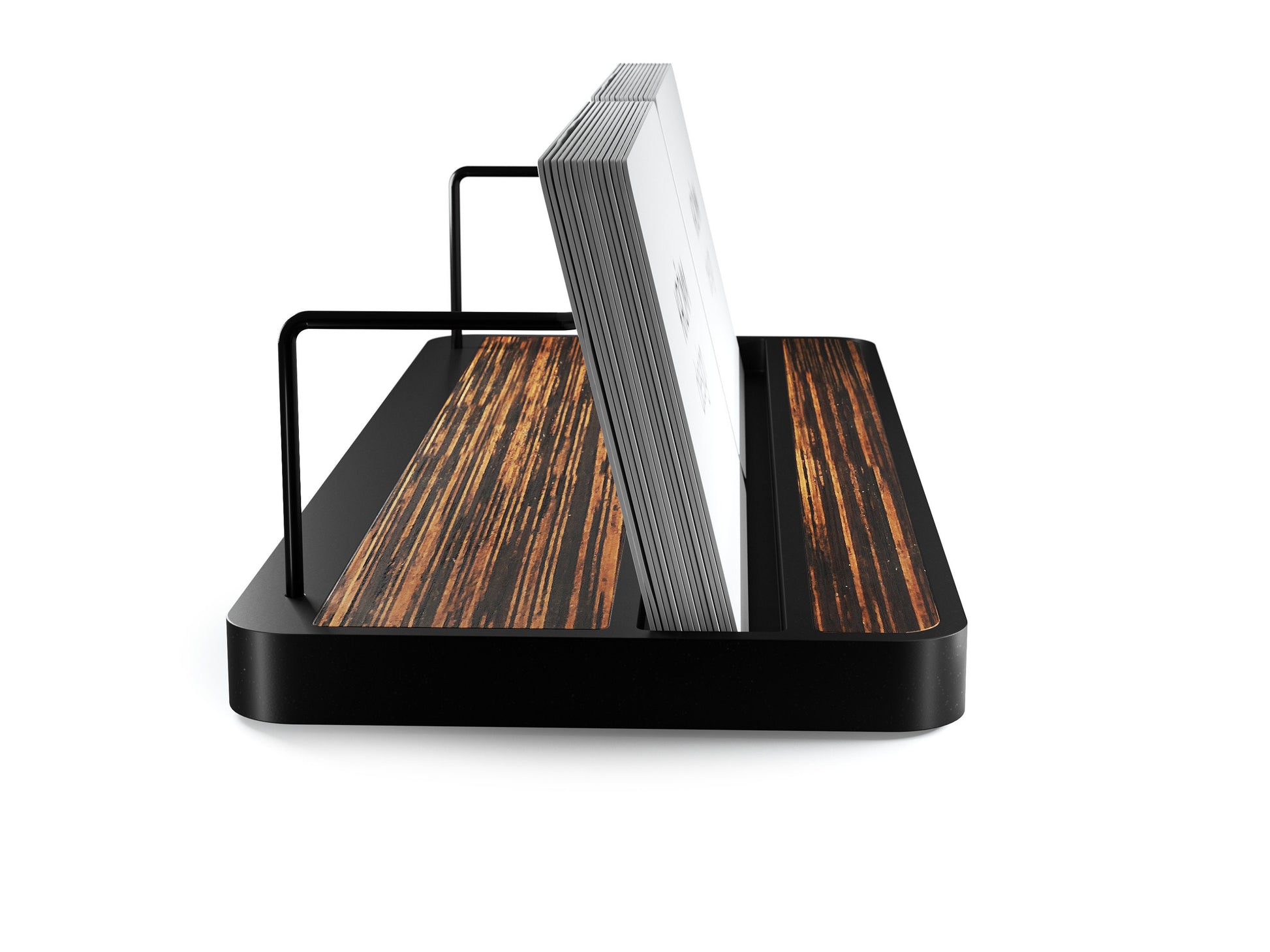 This modern business card stand / holder is made of black anodized aluminum and features luxury Macassar Ebony wood inserts.