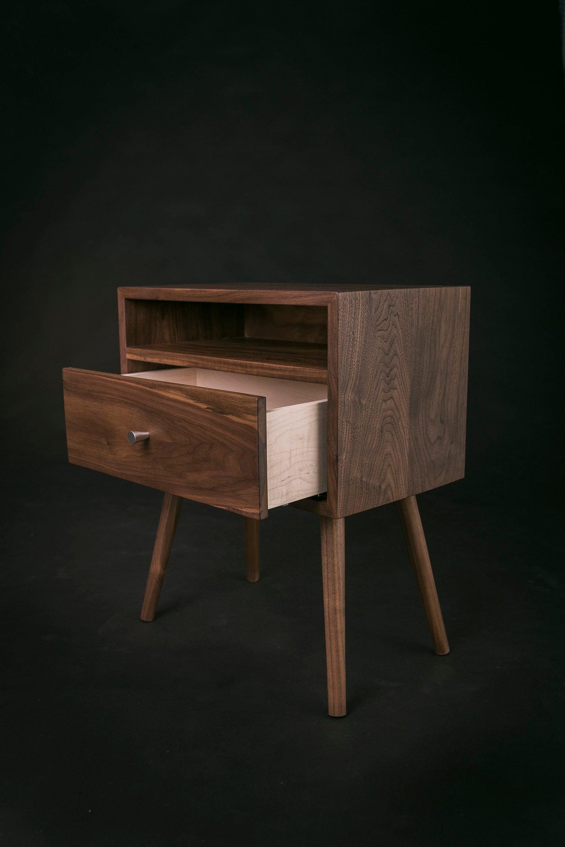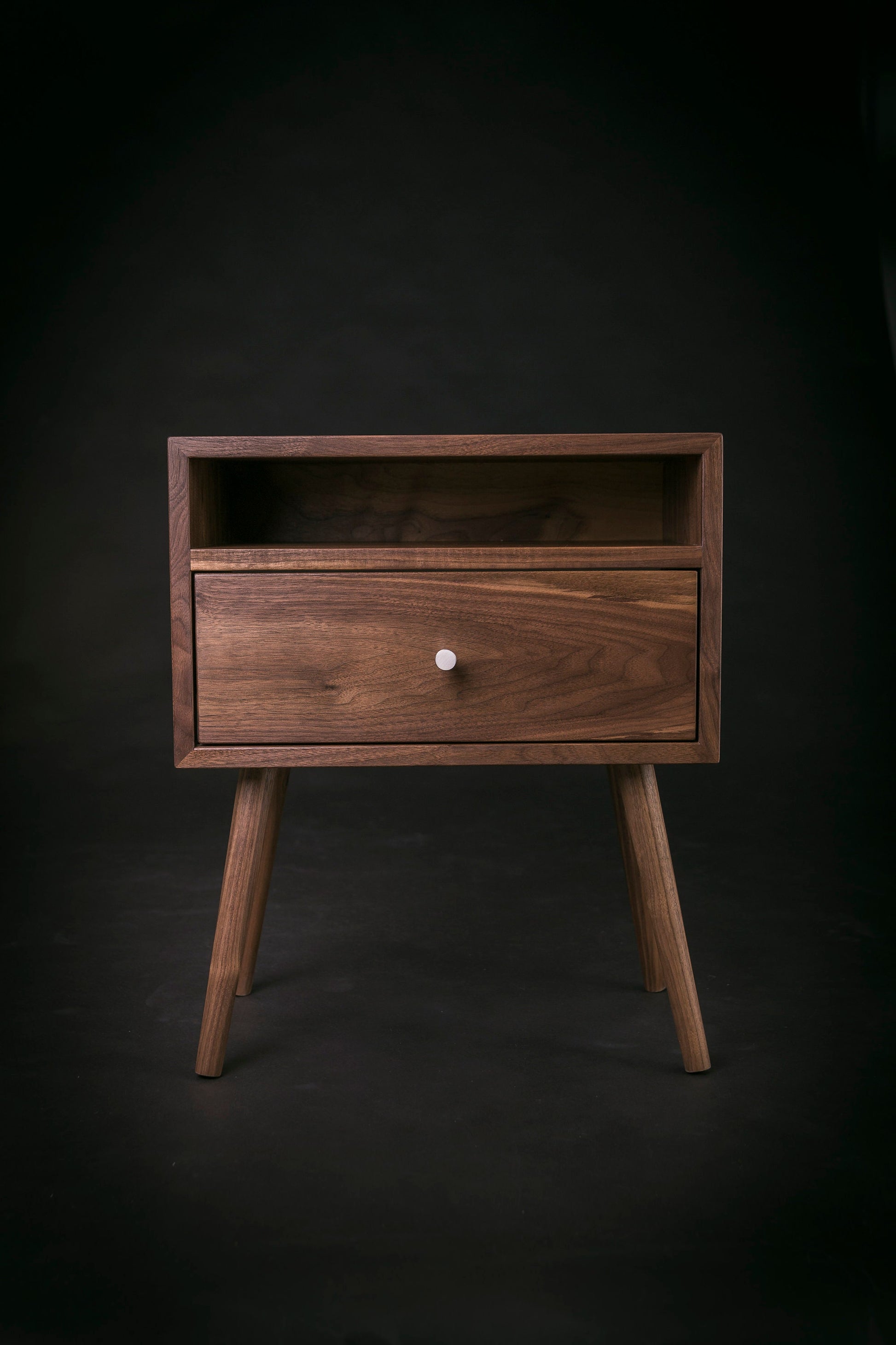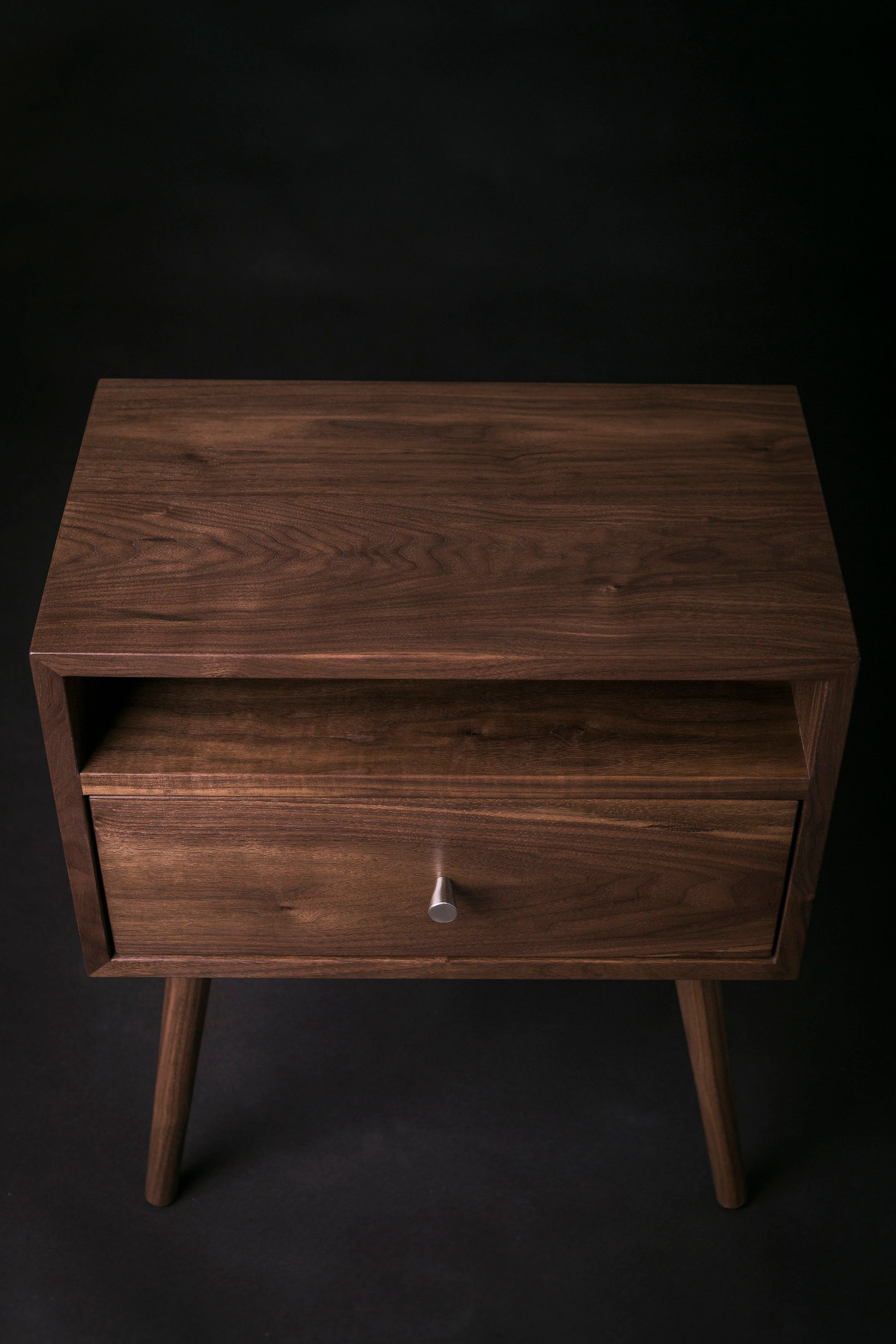 Our minimalist bedside table with a drawer and an open shelf, inspired by iconic Mid century design, is crafted by hand in solid American Black Walnut.