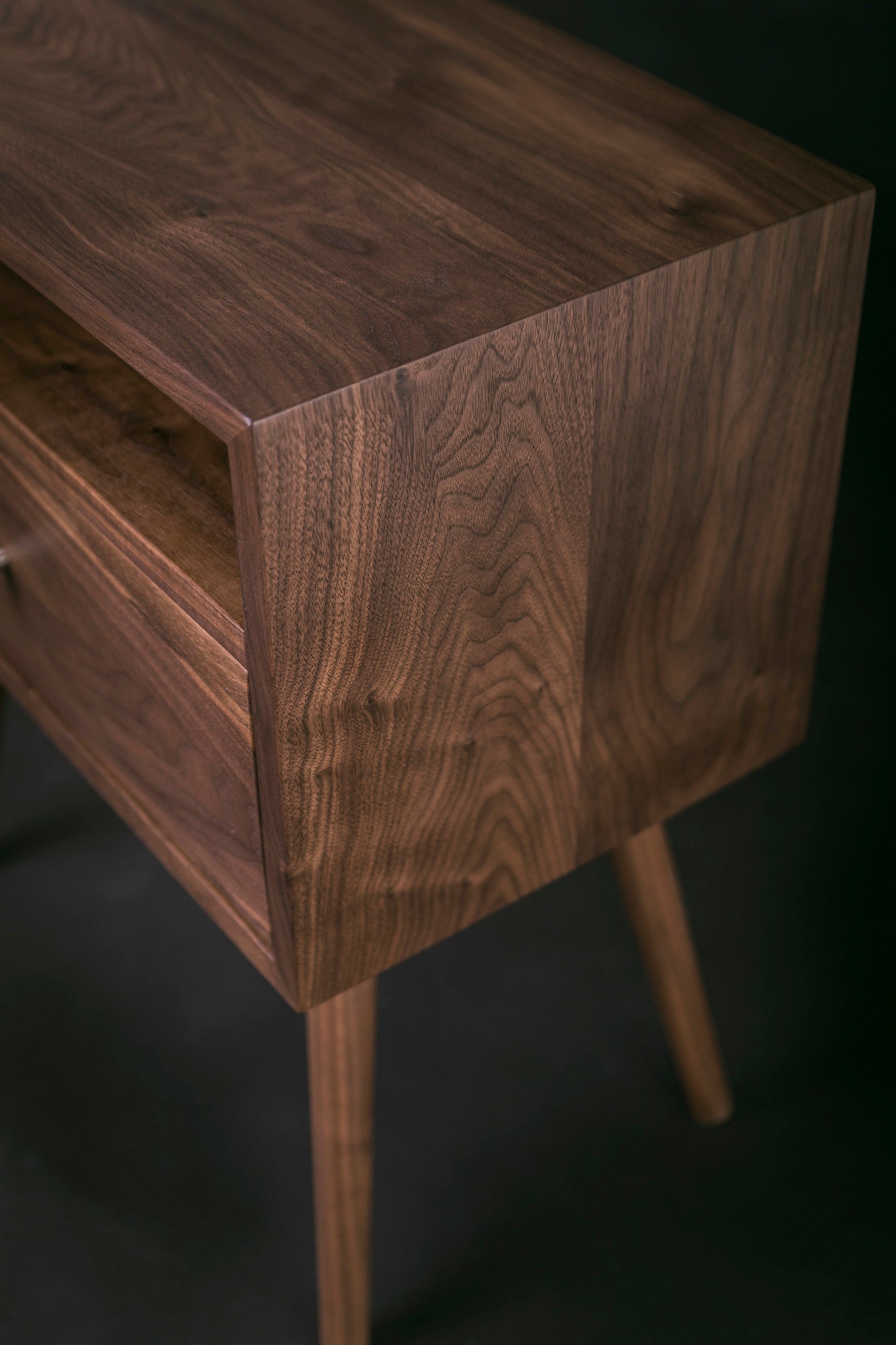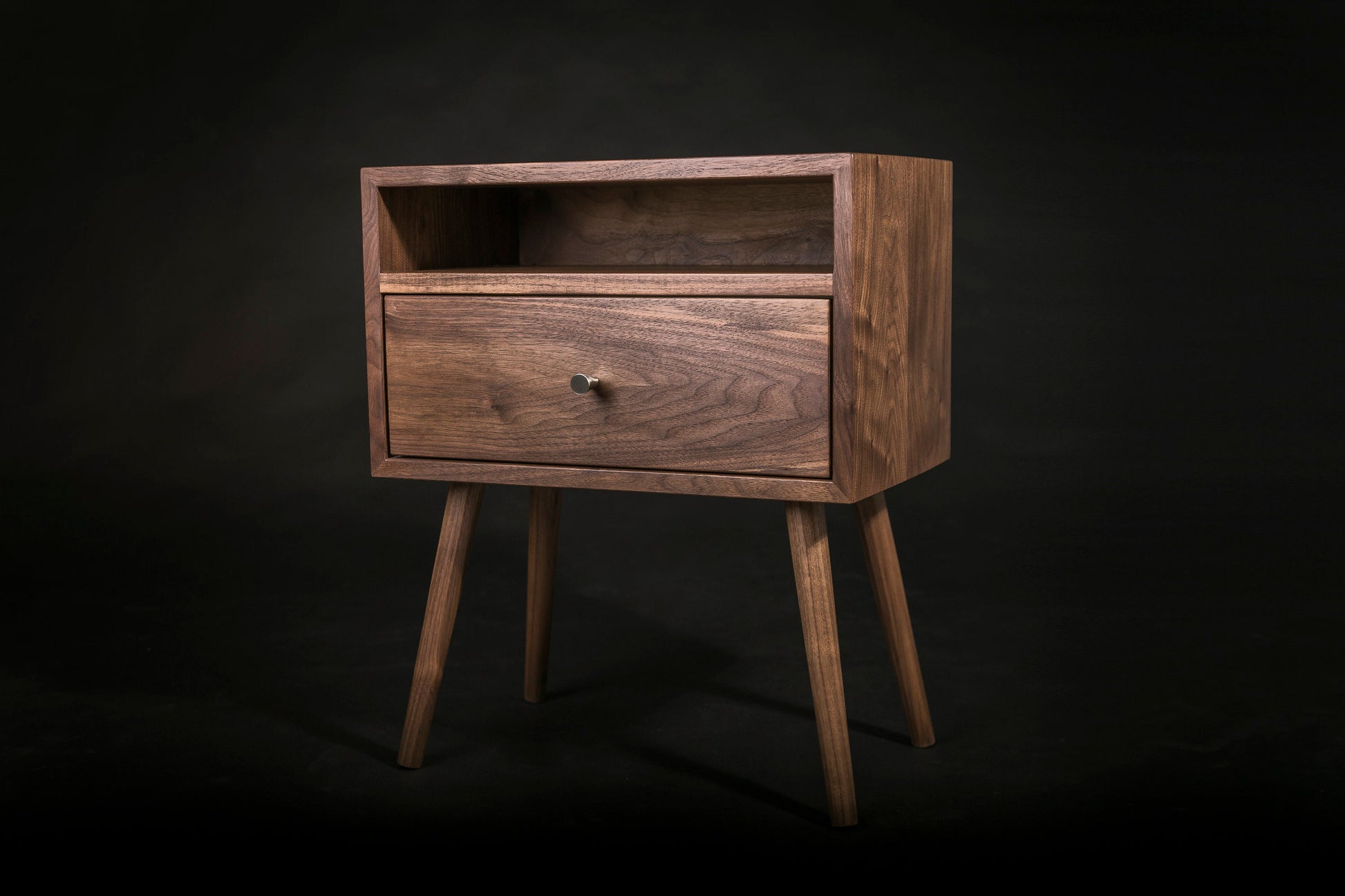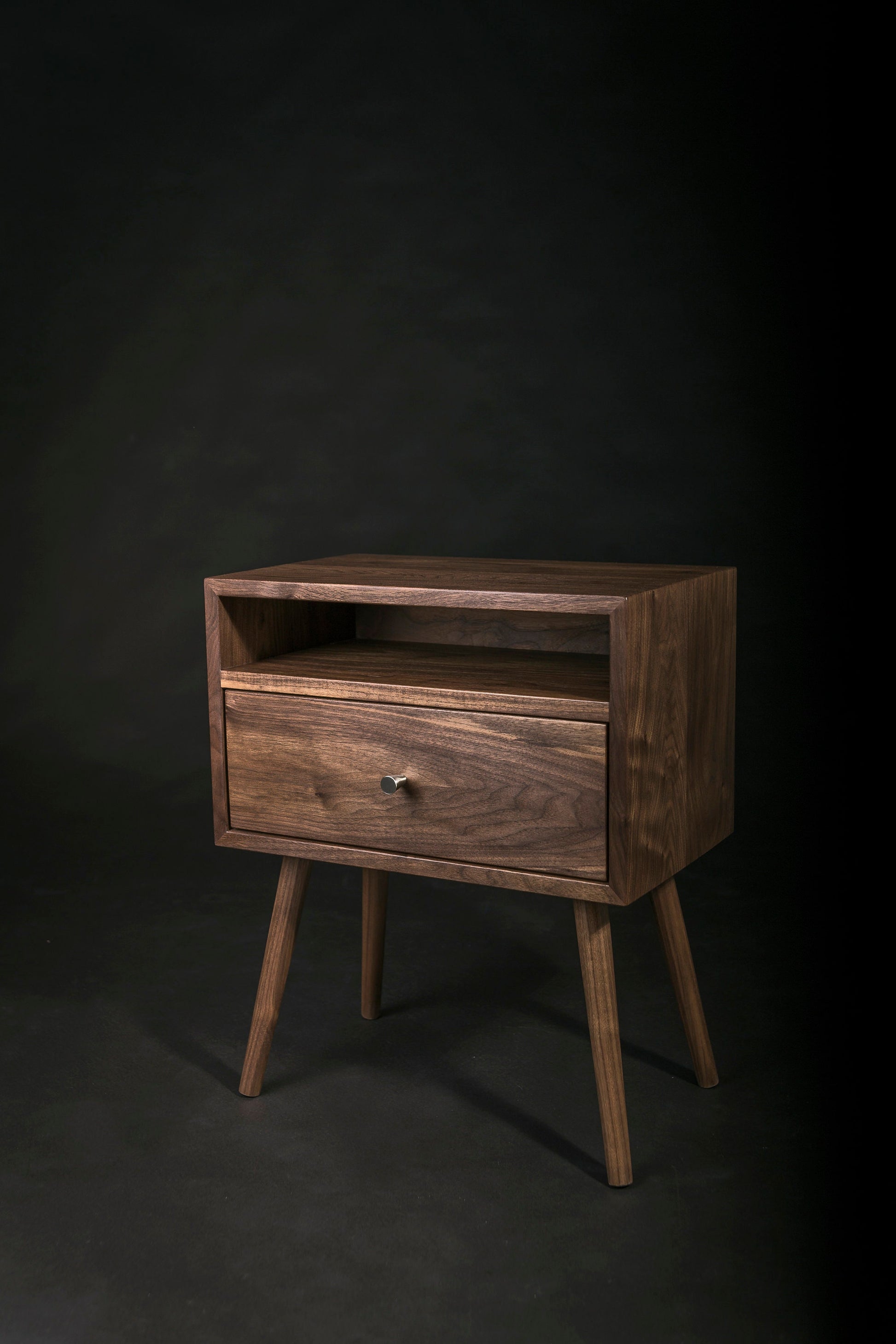 Our minimalist bedside table with a drawer and an open shelf, inspired by iconic Mid century design, is crafted by hand in solid American Black Walnut.