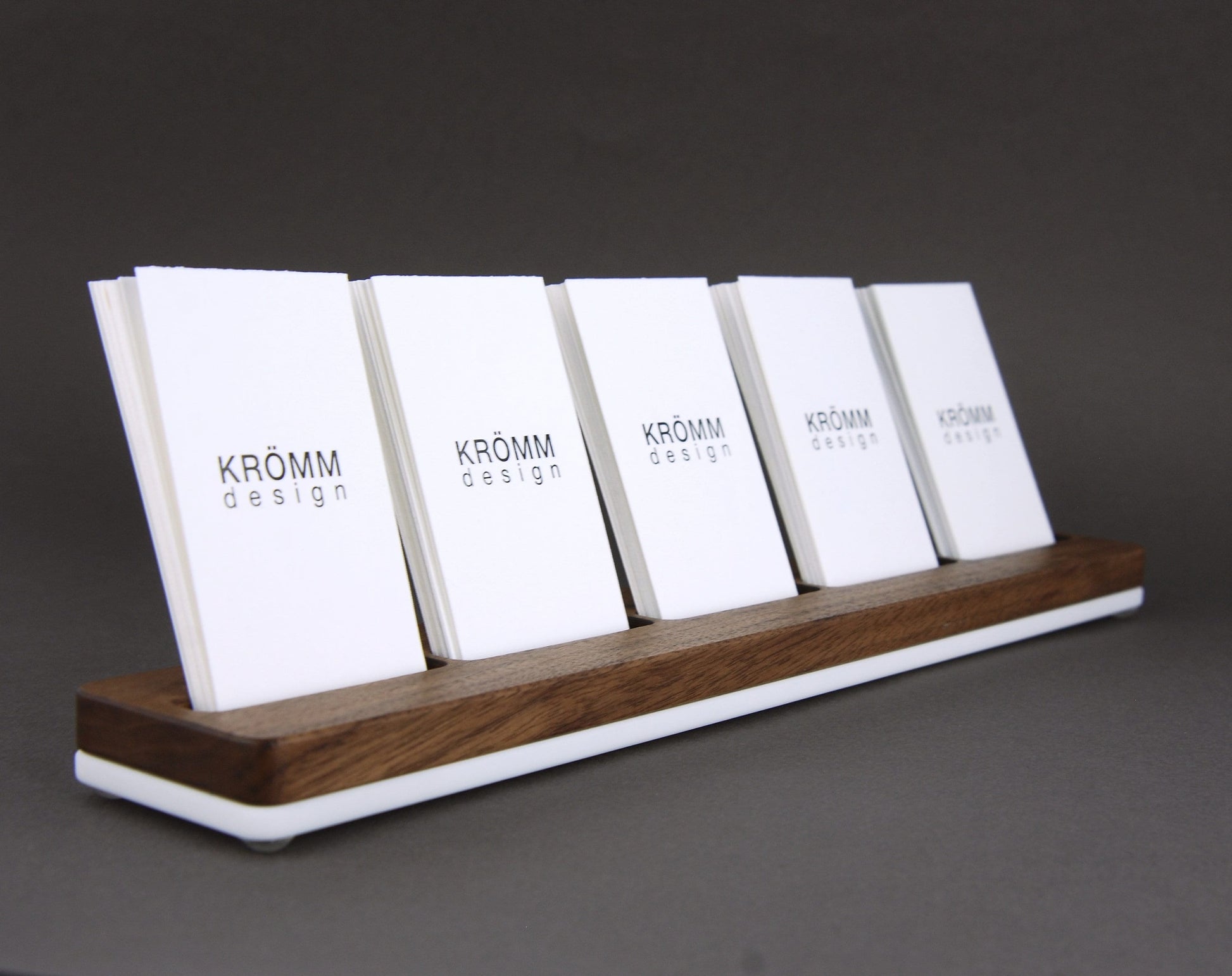 Simple but luxurious business card stand is made of solid black walnut wood and 1/4” white acrylic (on photo). Also available in Oak or Maple.