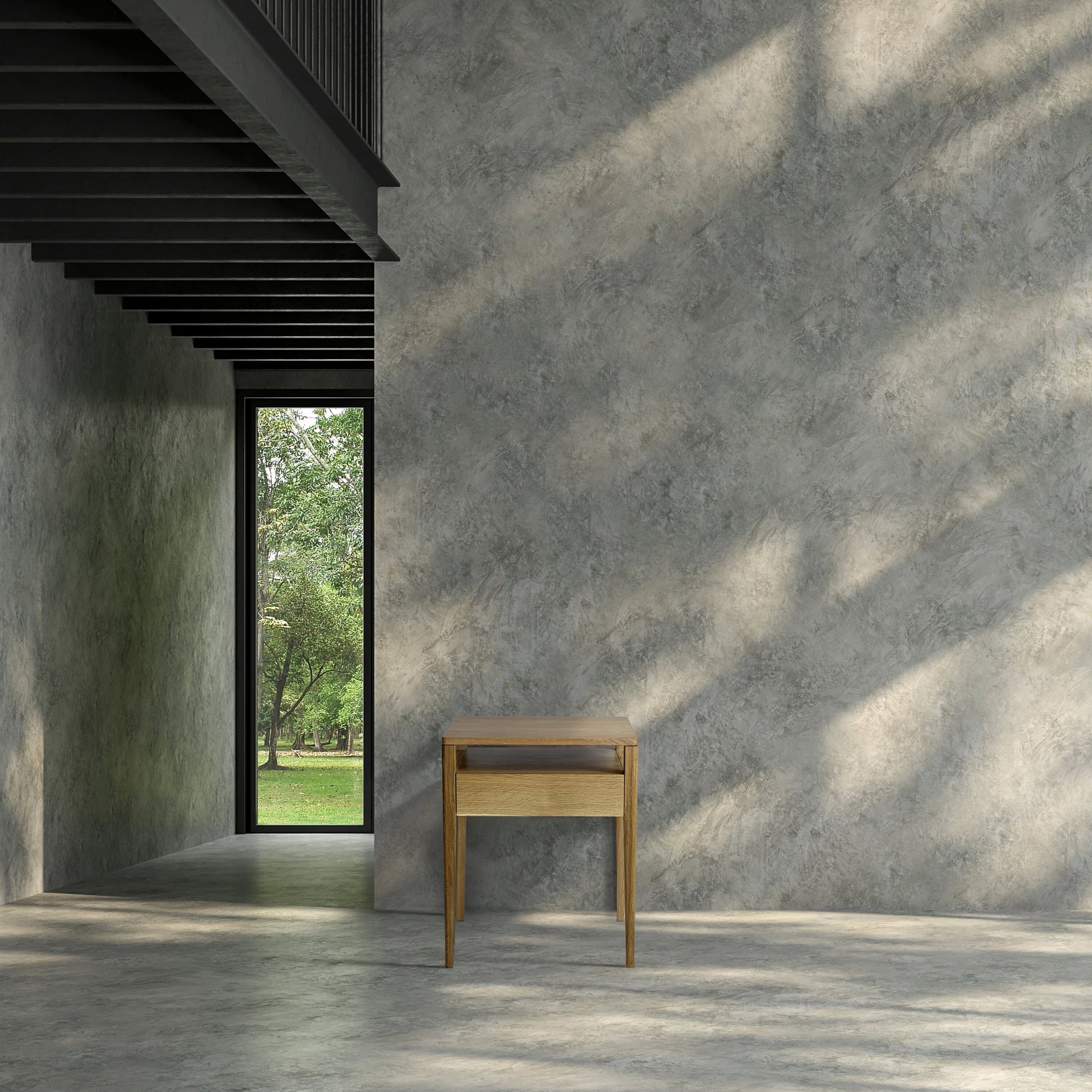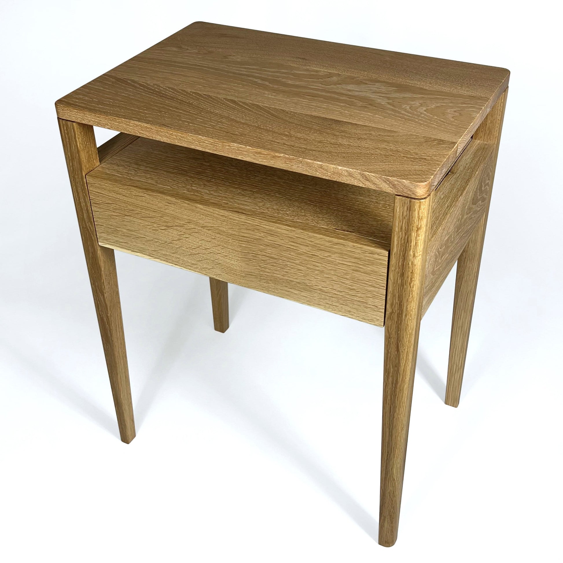 Our minimalist bedside table with a drawer and shelf, inspired by iconic Mid-century design, is crafted by hand in solid White Oak.