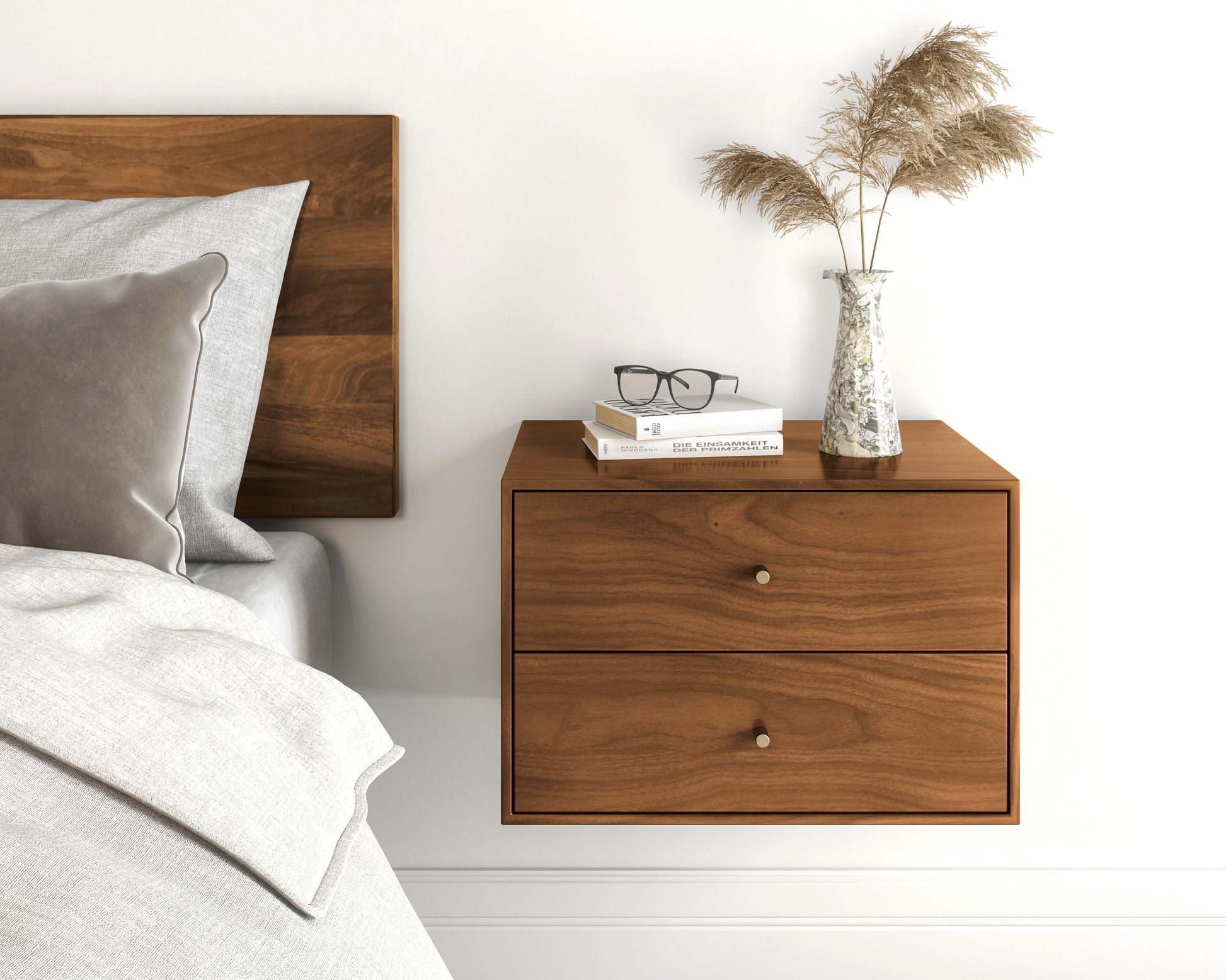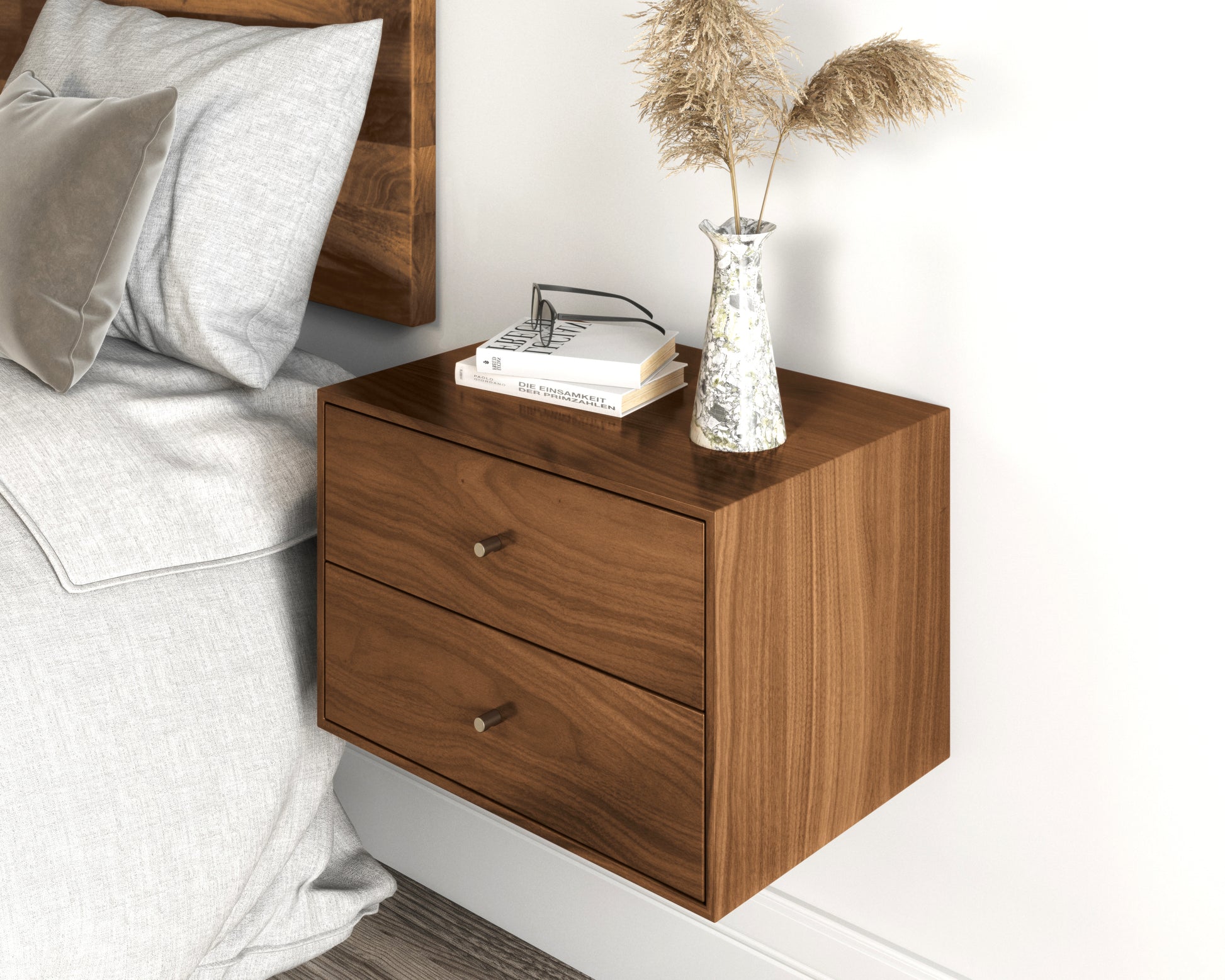 This minimalist floating bedside table with 2 drawers, inspired by iconic Mid-century design, is crafted by hand in solid Black Walnut wood.