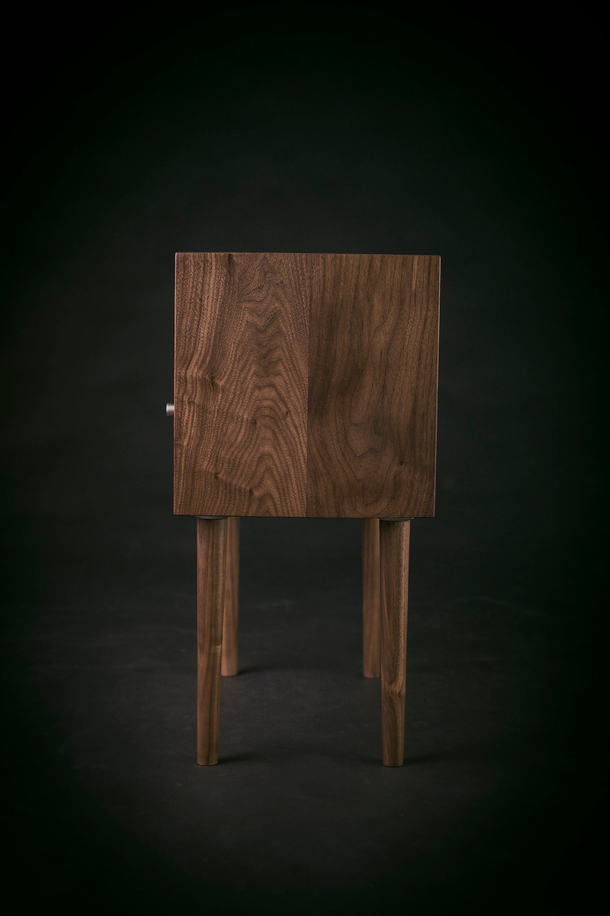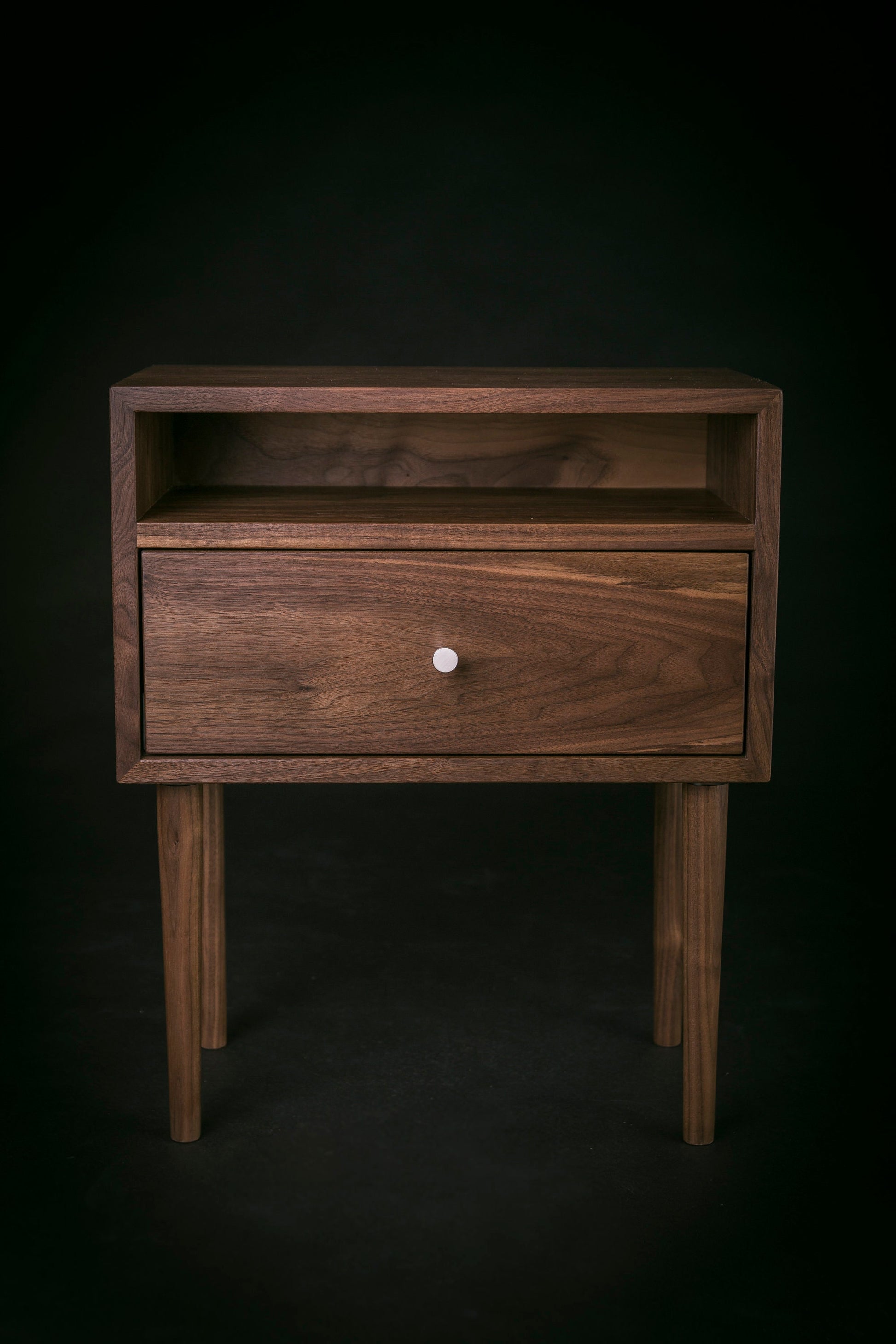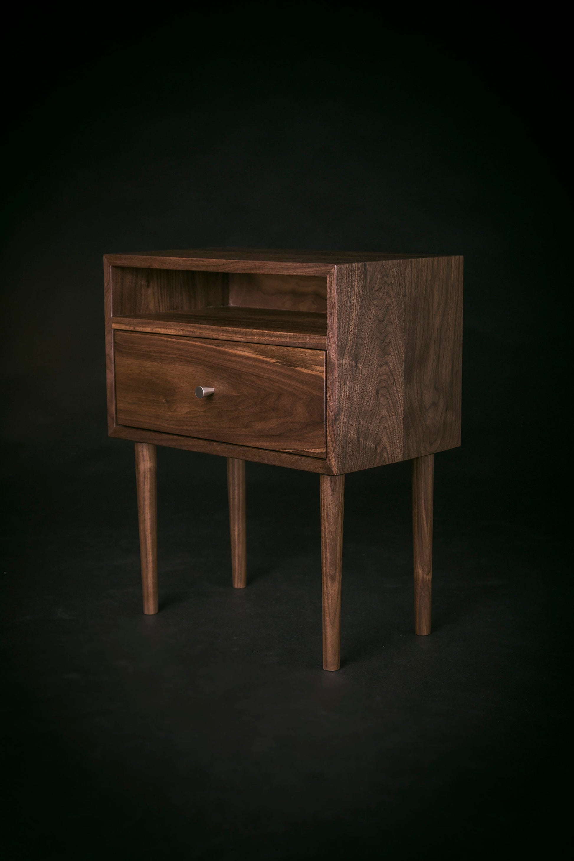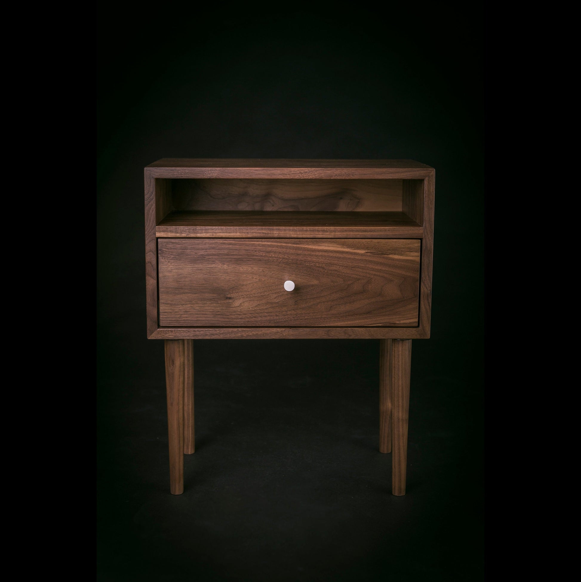 Our minimalist bedside table with a drawer and an open shelf, inspired by iconic Mid-century design, is crafted by hand in solid American Black Walnut.