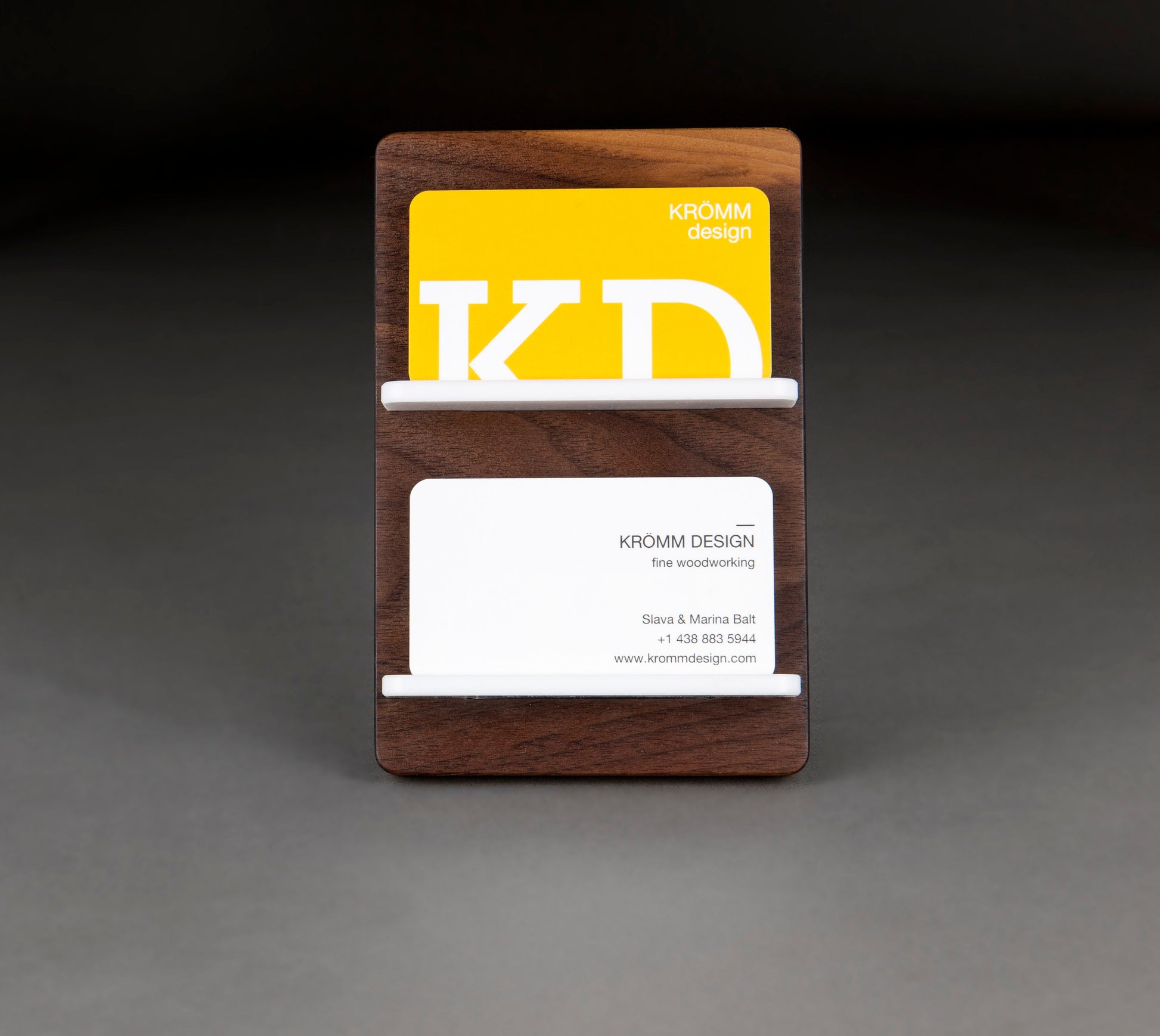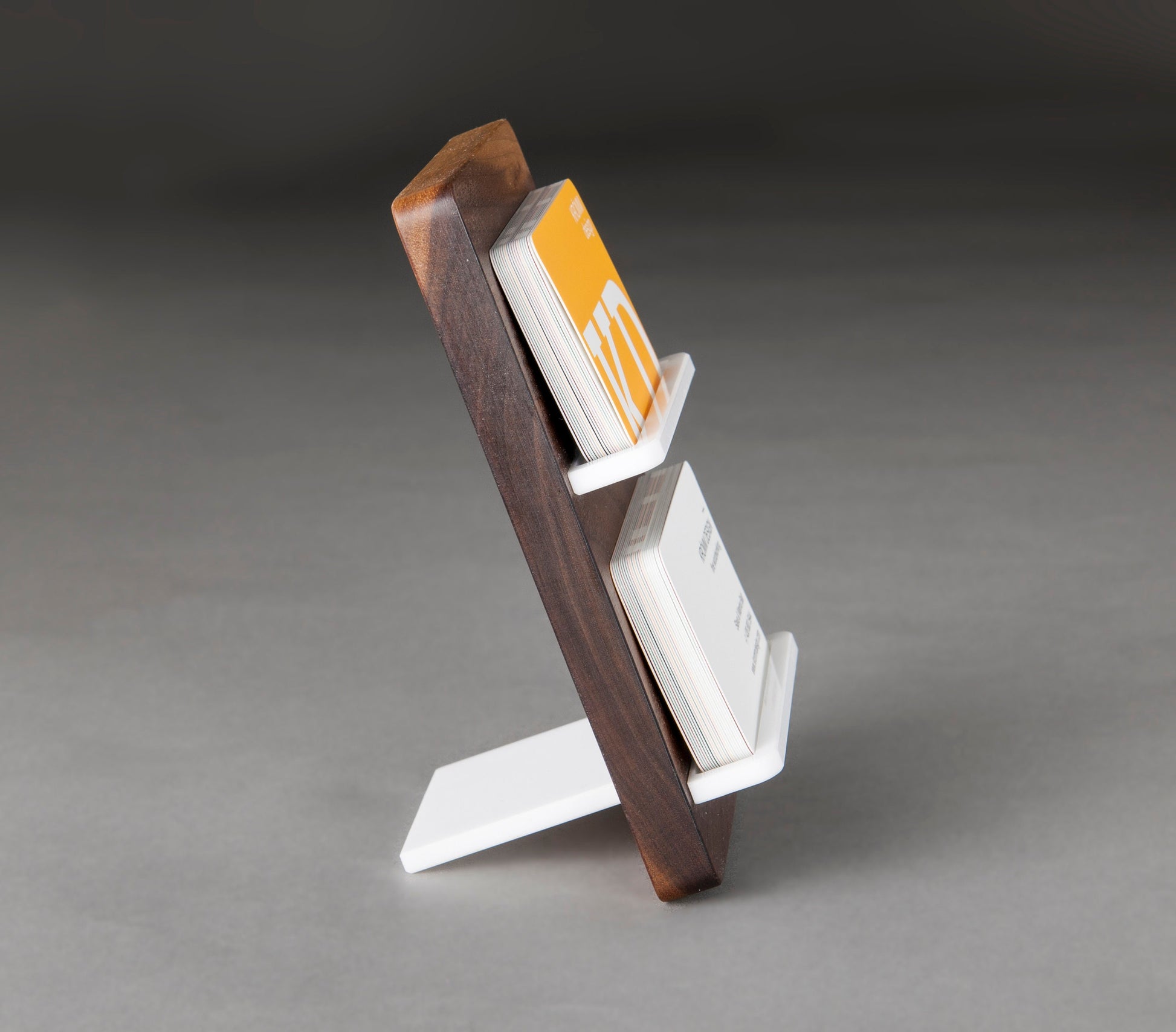 Minimalist business card stand for two cards is made of solid black walnut wood and white acrylic (on photo). Also available in Oak and Maple wood. Perfect final touch for a modern Desk / Office / Front Desk / Reception.