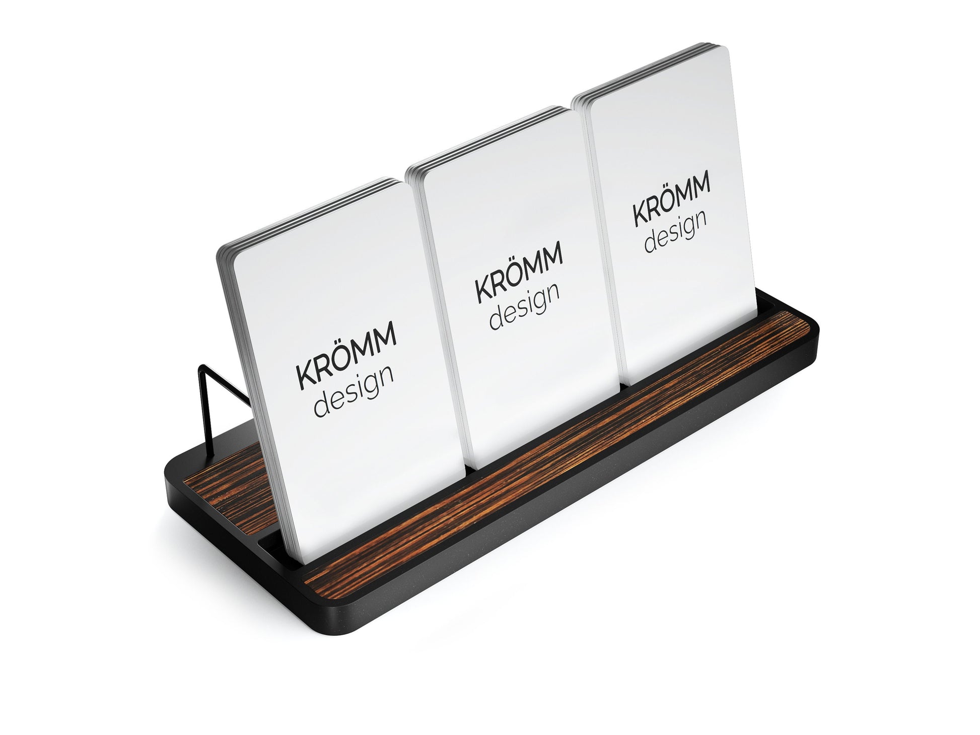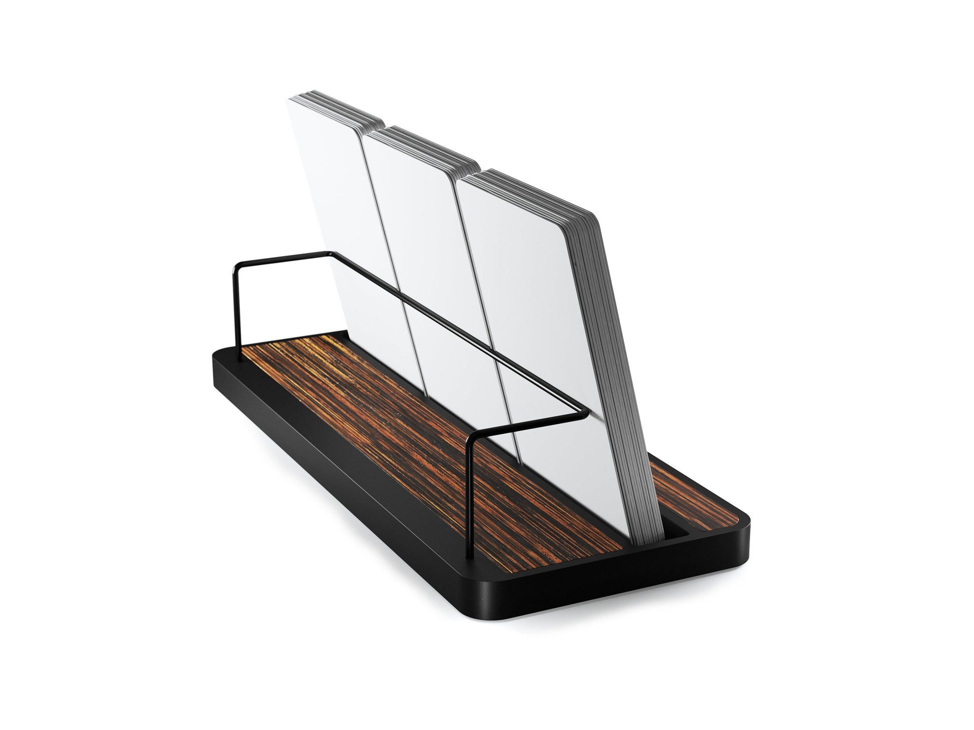 This modern vertical business card holder is made of black anodized aluminum and features luxury Macassar Ebony wood inserts.