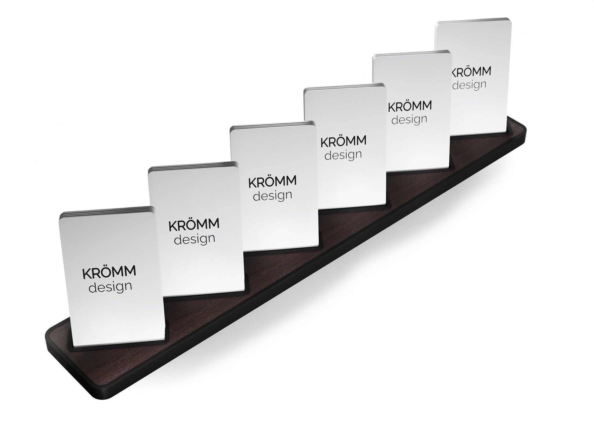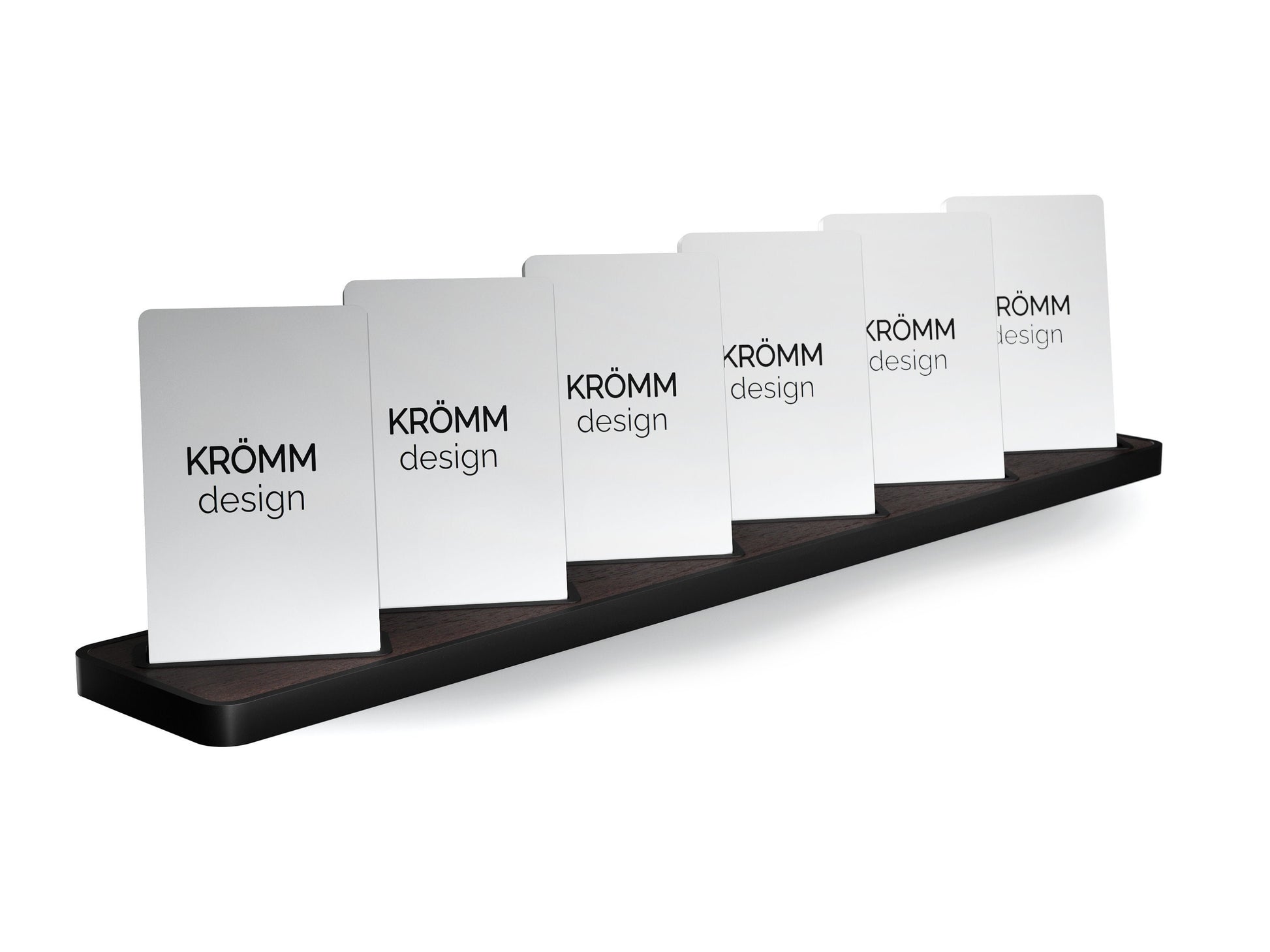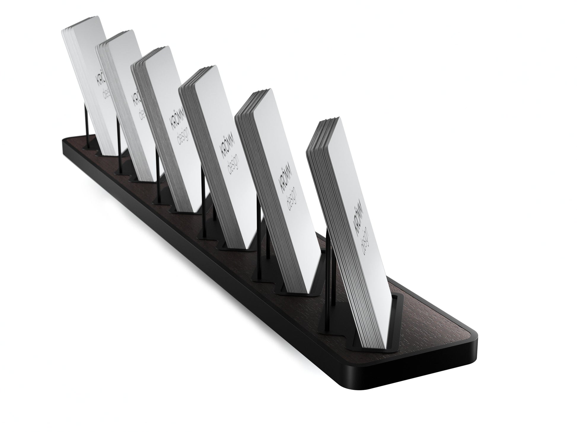 This modern business card display is made of black anodized aluminum and features luxury Wenge wood inserts.