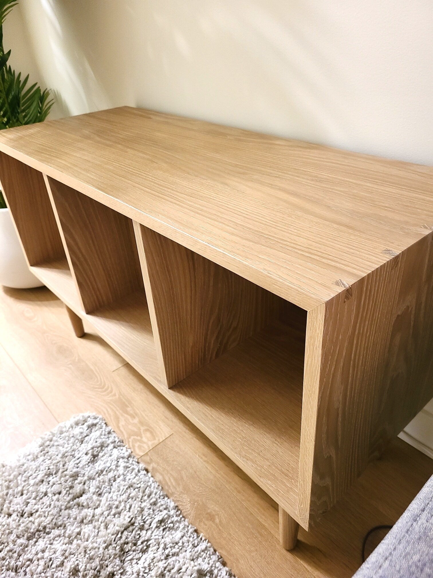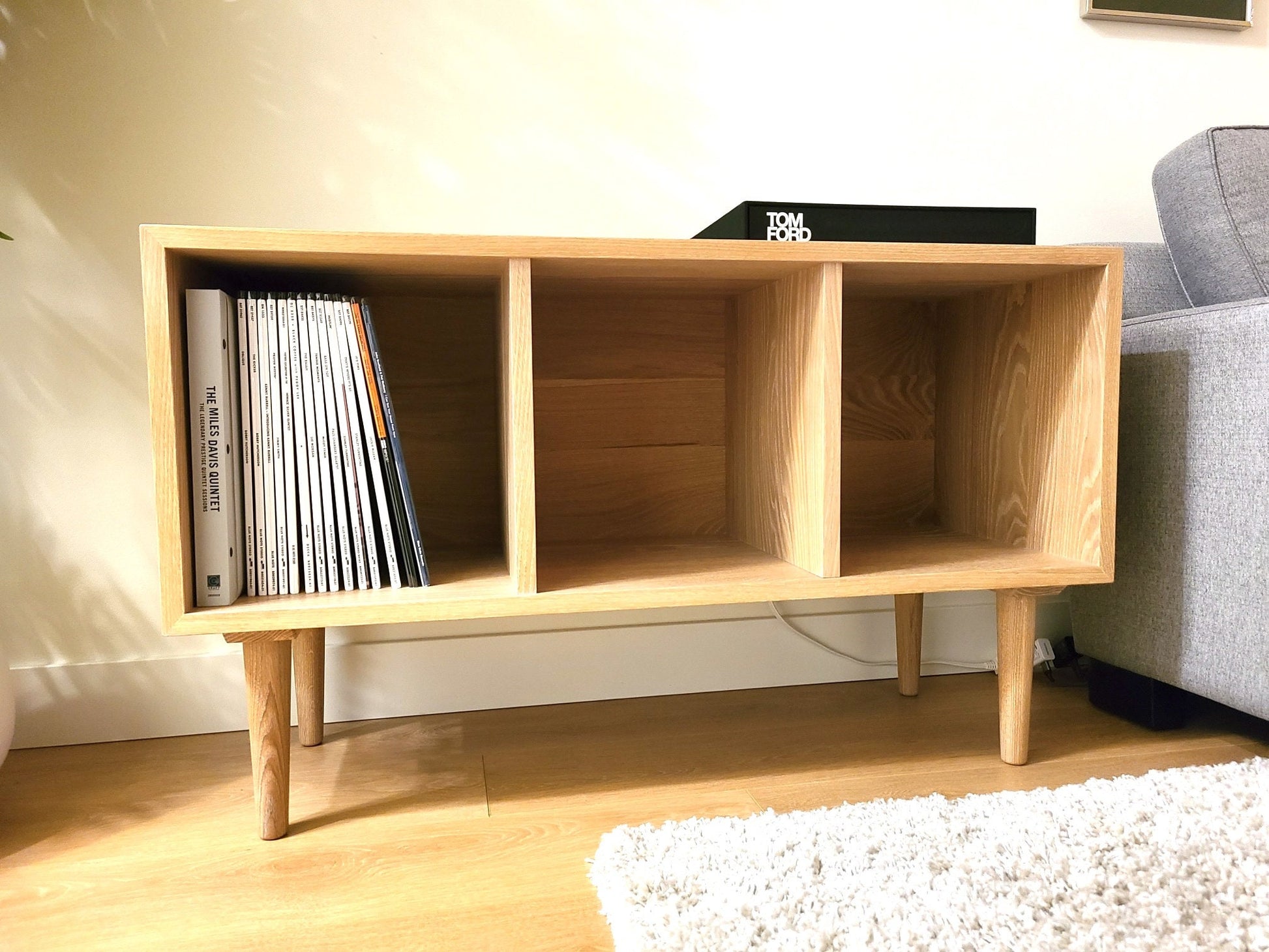 This Mid-century modern solid white oak console for vinyl record storage is crafted by hand from locally sourced white oak wood. Comes on elegant mid century style tapered legs.