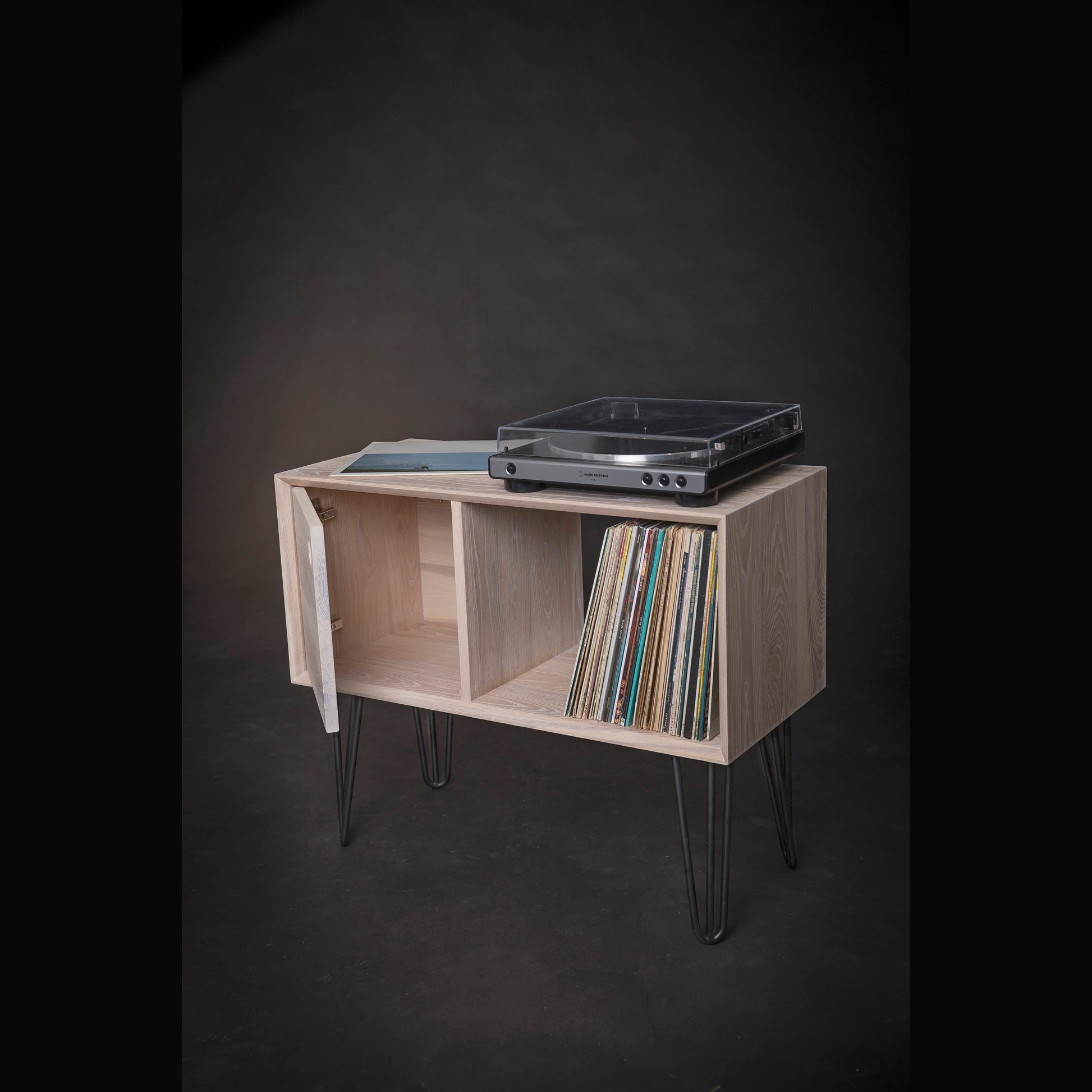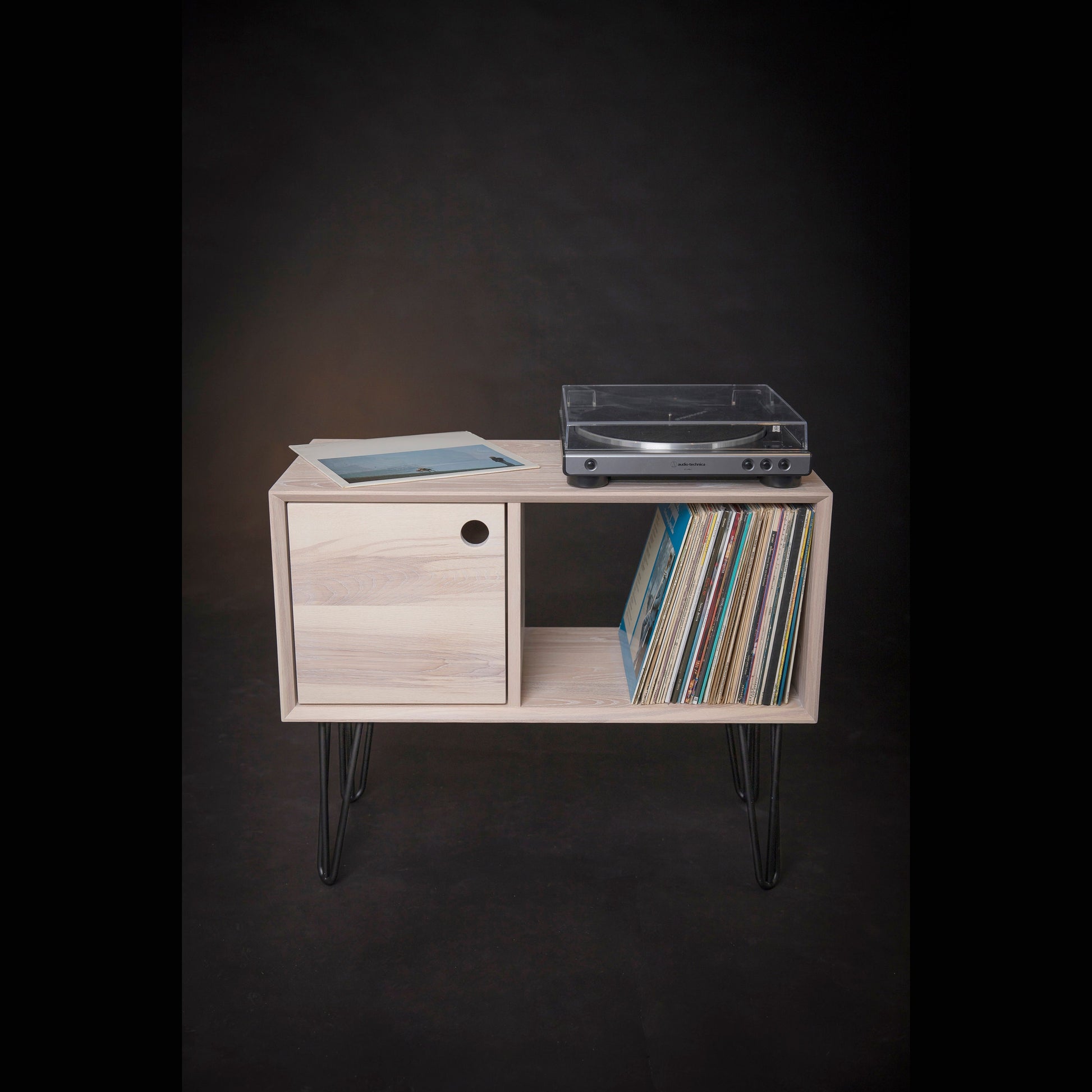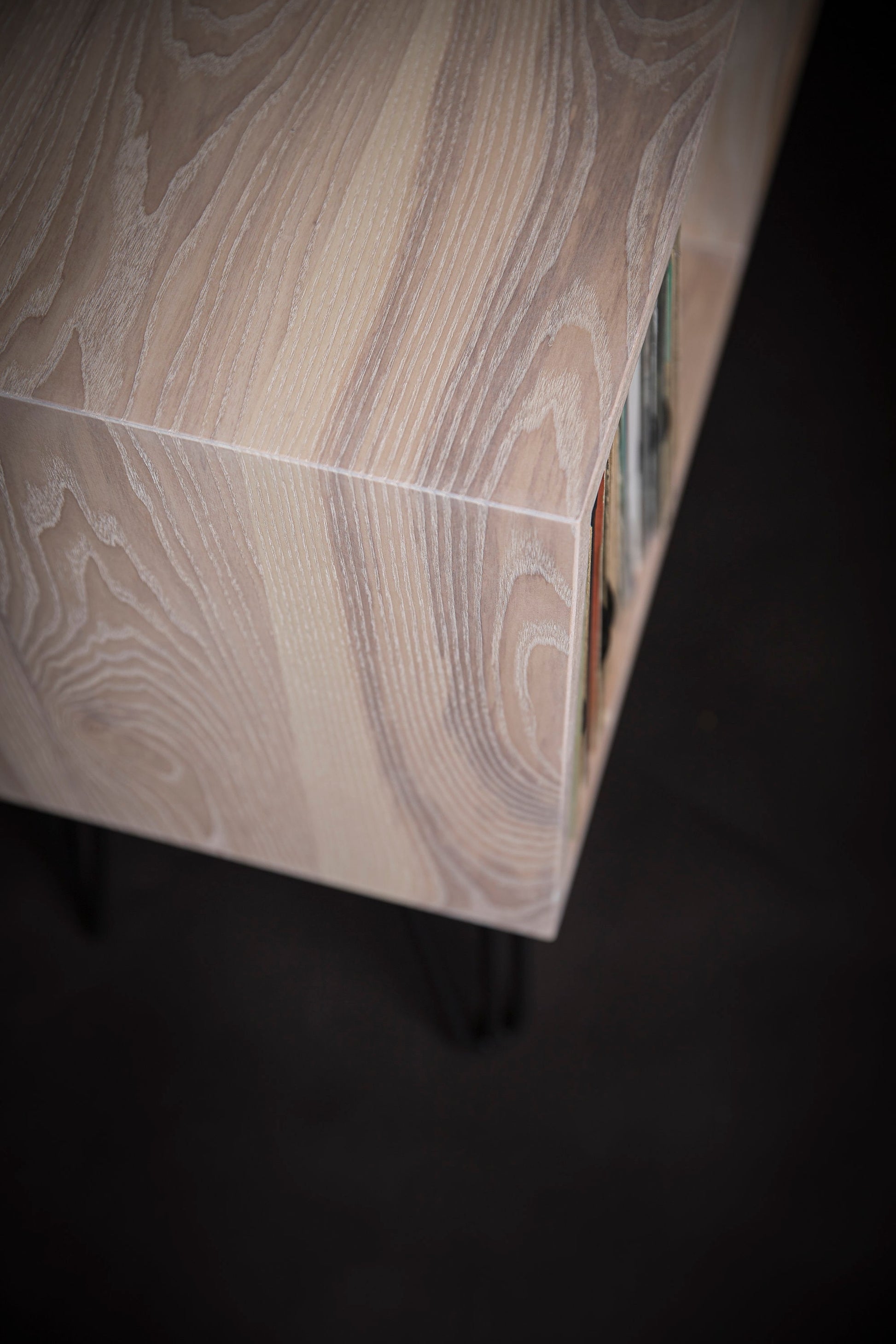 This Mid-century modern solid walnut wood console for vinyl record storage is crafted by hand from locally sourced White Ash wood. Comes on elegant black steel hairpin legs.