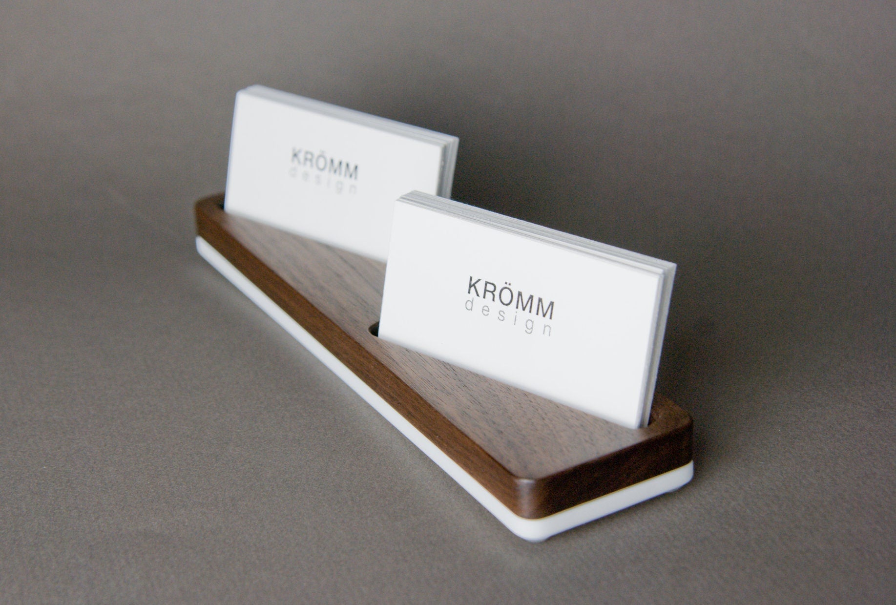 Simple but luxurious business card stand is made of solid black walnut wood and 1/4” white acrylic (on photo). Also available in Oak or Maple.